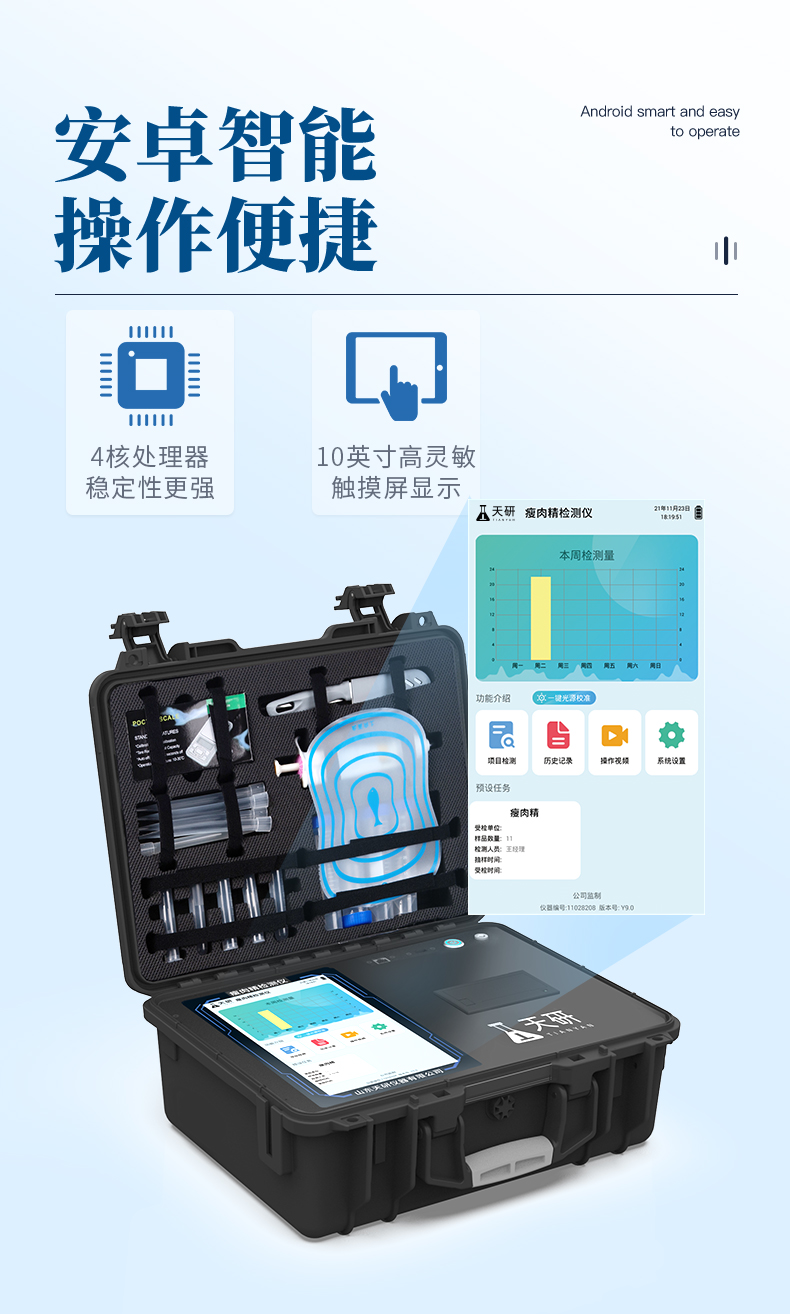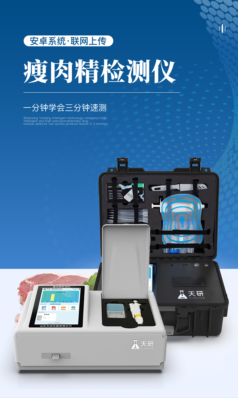瘦肉精檢測(cè)儀可現(xiàn)場(chǎng)快速檢測(cè)鹽酸克倫特羅、萊克多巴胺、沙丁胺醇、己烯雌酚、喹乙醇等。儀器預(yù)留其他項(xiàng)目檢測(cè)程序和端口,根據(jù)日后需求可方便的自主增加檢測(cè)項(xiàng)目。日后可升級(jí)為檢測(cè)抗生素、獸藥殘留、動(dòng)物疫病、病害肉、的綜合類型儀器