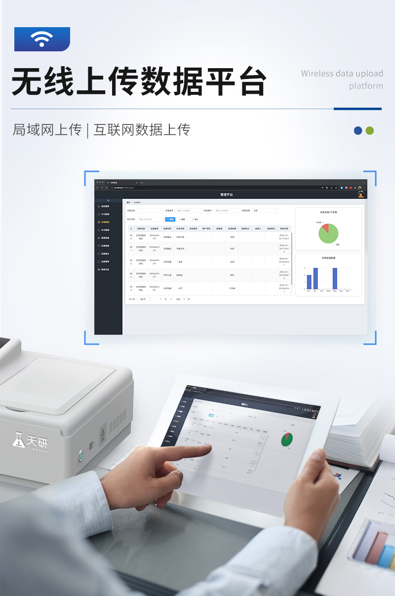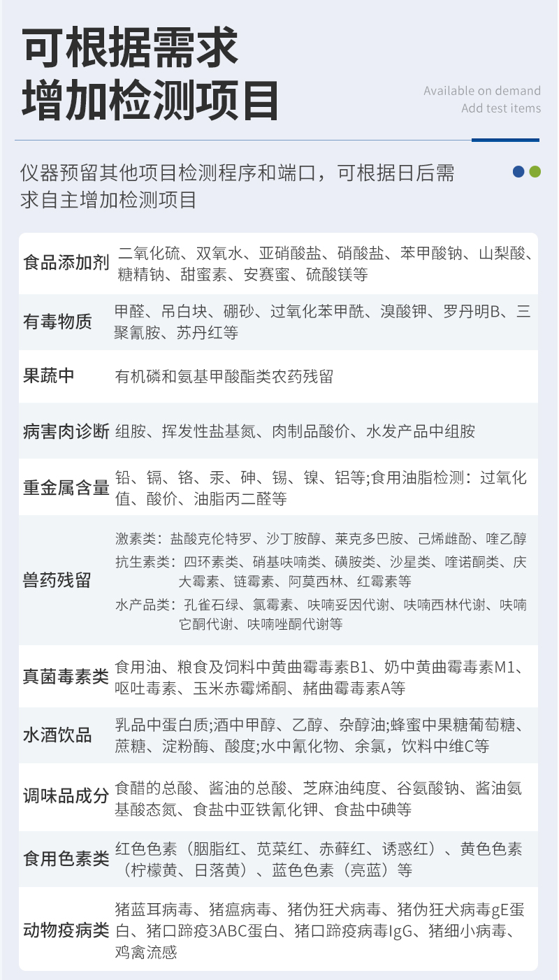 | 儀器采用手提一體化系統(tǒng)檢測(cè)技術(shù),將分光光度模塊、數(shù)字化管理模塊、無(wú)線通訊模塊高度集成于一體,可支持檢測(cè)60種食品安全檢測(cè)項(xiàng)目,同時(shí)預(yù)留升級(jí)檢測(cè)方法。 | 儀器檢測(cè)模塊標(biāo)準(zhǔn)化、智能化,檢測(cè)項(xiàng)目可隨意自由組合。檢測(cè)箱體內(nèi)置多個(gè)標(biāo)準(zhǔn)檢測(cè)單元,檢測(cè)模塊可以調(diào)整配置。 | 儀器采用全新安卓智能系統(tǒng),主控芯片采用 ARM Cortex-A7,RK3288/4核處理器,10.1寸高清液晶觸摸豎屏,更加**的UI交互界面,運(yùn)轉(zhuǎn)快捷;儀器配備無(wú)線通信模塊: 4G(APN)通訊模塊、Wifi模塊,藍(lán)牙傳輸,同時(shí)具有雙USB接口以及RJ45接口能以多種方式實(shí)現(xiàn)數(shù)據(jù)保存和數(shù)據(jù)傳輸功能。 | 顯示屏幕:儀器采用10.1英寸豎向液晶觸摸屏顯,搭配運(yùn)行安卓智能操作系統(tǒng),主控芯片采用ARM Cortex-A7,RK3288/4核處理器,主頻1.88Ghz,操作方便,性能更強(qiáng)。 | 檢測(cè)通道:≥12通道;采用精密旋轉(zhuǎn)比色池設(shè)計(jì),使用同芯片同光源校準(zhǔn)精度,解決不同光源之間的誤差值,更加準(zhǔn)確**。(1-12通道間誤差0.1%,**號(hào):ZL202022821055.2) | 儀器光源:高精度進(jìn)口四波長(zhǎng)冷光源,每個(gè)通道均配置 410、520、590、630nm 波長(zhǎng)光源,標(biāo)配**的光路切換裝置,**光路切換功能可實(shí)現(xiàn)64波長(zhǎng),并且所有檢測(cè)項(xiàng)目可實(shí)現(xiàn)所有通道同時(shí)檢測(cè)。 | 設(shè)備可一鍵校準(zhǔn),自動(dòng)保存校準(zhǔn)數(shù)據(jù),自動(dòng)對(duì)比校驗(yàn),得到精準(zhǔn)光源,采用Android SP存儲(chǔ)數(shù)據(jù),光源數(shù)據(jù)永不丟失,方便每一次使用。 | 通訊接口:配備無(wú)線通信模塊、4G(APN)通訊模塊、藍(lán)牙傳輸,同時(shí)具有雙USB接口以及RJ45網(wǎng)線接口,可以多方式實(shí)現(xiàn)數(shù)據(jù)保存及數(shù)據(jù)傳輸。 | 存儲(chǔ)方式:支持U盤存儲(chǔ),標(biāo)準(zhǔn)USB接口,免驅(qū)動(dòng)安裝。檢測(cè)結(jié)果存儲(chǔ)容量20萬(wàn)條以上,可生成Excel表格進(jìn)行拷貝,并具有登錄保護(hù)功能。 | 智能化操作系統(tǒng): | 1、操作系統(tǒng):儀器可在同一檢測(cè)界面自動(dòng)對(duì)應(yīng)相關(guān)檢測(cè)通道,一次性選擇1-12個(gè)樣品名稱,無(wú)需退出界面,節(jié)省操作時(shí)間。并可以對(duì)每個(gè)通道屬性和樣品信息單獨(dú)進(jìn)行編輯,例如送檢單位、人員,檢測(cè)人員等,打印時(shí)勾選打印顯示。 | 2、數(shù)據(jù)集成系統(tǒng):設(shè)備首頁(yè)自動(dòng)匯總分析檢測(cè)數(shù)據(jù),包含:周檢測(cè)數(shù)據(jù)、月檢測(cè)數(shù)據(jù),全部檢測(cè)總數(shù)量,均包含檢測(cè)總數(shù),合格數(shù),不合格數(shù),以及相關(guān)柱形分析圖,各項(xiàng)檢測(cè)數(shù)據(jù)一目了然,無(wú)需電腦查詢,更加快捷直觀。 | 3、數(shù)據(jù)庫(kù)系統(tǒng):十幾項(xiàng)數(shù)據(jù)庫(kù)分類管理儀器:包含項(xiàng)目類型、項(xiàng)目數(shù)據(jù)、檢測(cè)數(shù)據(jù)、歷史記錄、國(guó)標(biāo)信息、曲線信息、采樣信息、檢測(cè)信息、受檢信息、復(fù)核信息、圖表信息、光源校準(zhǔn)信息、打印樣式信息、樣品庫(kù)信息等等,數(shù)據(jù)庫(kù)之間互相協(xié)調(diào)聯(lián)動(dòng)保證數(shù)據(jù)的真實(shí)完整性。同時(shí)產(chǎn)品數(shù)據(jù)庫(kù)以及歷史檢測(cè)記錄支持一鍵檢索功能。 | 4、限量規(guī)判系統(tǒng):具有限量查詢、添加物質(zhì)合規(guī)判定系統(tǒng)。檢測(cè)出結(jié)果后,系統(tǒng)自動(dòng)調(diào)用系統(tǒng)數(shù)據(jù)庫(kù)中相關(guān)國(guó)標(biāo)進(jìn)行比對(duì)判定,客觀顯示判定結(jié)果是否合格。 | 5、項(xiàng)目預(yù)設(shè)系統(tǒng):儀器具有任務(wù)預(yù)設(shè)模塊,一鍵提前預(yù)設(shè),給出方便快捷的新檢測(cè)方案,每一個(gè)任務(wù)分別可以設(shè)置不同的樣品、批次、編號(hào)、來(lái)源、備注、抽樣信息、檢測(cè)信息、受檢信息、復(fù)核信息等更多信息。樣品送檢時(shí)一鍵調(diào)取保存信息,并可多次調(diào)取,大大提高檢測(cè)效率。 | 6、數(shù)據(jù)監(jiān)管系統(tǒng):同步對(duì)接監(jiān)管平臺(tái),數(shù)據(jù)可局域網(wǎng)和互聯(lián)網(wǎng)數(shù)據(jù)上傳,檢測(cè)結(jié)果可選擇直接傳至食品安全監(jiān)管平臺(tái)。進(jìn)行區(qū)域食品安全監(jiān)管及大數(shù)據(jù)分析處理與數(shù)據(jù)統(tǒng)計(jì),檢測(cè)區(qū)域食品安全長(zhǎng)短期動(dòng)態(tài),達(dá)到食品安全問(wèn)題預(yù)估、預(yù)警。 | 7、全新打印系統(tǒng):內(nèi)置全新打印機(jī),新創(chuàng)自定義打印方式,可按需靈活勾選控制:二維碼,抽樣信息、檢測(cè)信息,受檢信息、復(fù)核信息、抽樣日期、檢測(cè)日期等信息的打印。 | 8、A4紙版本報(bào)告打印功能(可選配):設(shè)備擁有兩種結(jié)果展示方式,可以自動(dòng)生成A4打印模板和小票打印模板兩種樣式,可通過(guò)WiFi及網(wǎng)線等方式鏈接外置打印機(jī)可進(jìn)行打印。 | 供電模式:儀器交直流兩用,直流12V供電,可連接車載電源,可配6ah大容量充電鋰電池,電量可實(shí)時(shí)顯示,方便戶外流動(dòng)測