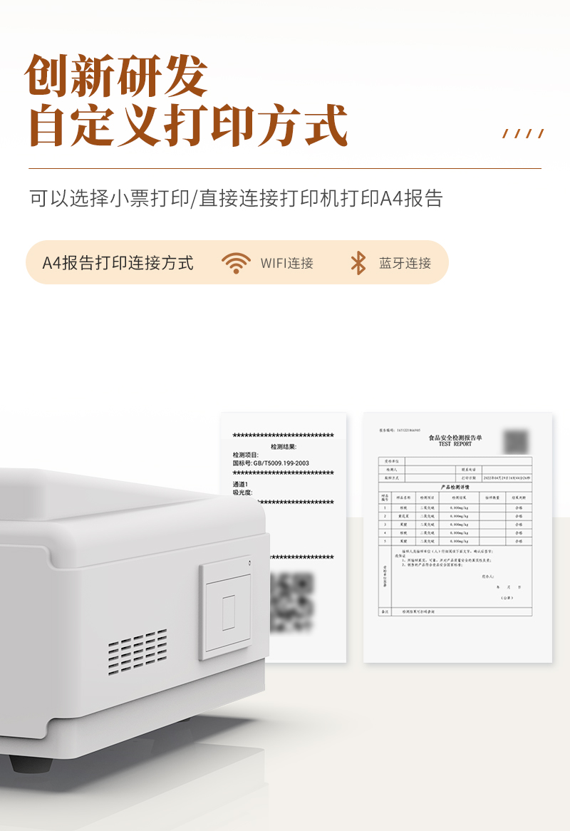 | 儀器采用手提一體化系統(tǒng)檢測(cè)技術(shù),將分光光度模塊、膠體金檢測(cè)模塊、新型農(nóng)殘檢測(cè)模塊、數(shù)字化管理模塊、無(wú)線通訊模塊高度集成于一體,支持檢測(cè)200種食品安全檢測(cè)項(xiàng)目,同時(shí)預(yù)留升級(jí)檢測(cè)方法。 | 儀器檢測(cè)模塊標(biāo)準(zhǔn)化、智能化,檢測(cè)項(xiàng)目可隨意自由組合。檢測(cè)箱體內(nèi)置多個(gè)標(biāo)準(zhǔn)檢測(cè)單元,檢測(cè)模塊可以調(diào)整配置。 | 顯示屏幕:儀器采用10.1英寸豎向液晶觸摸屏顯,搭配運(yùn)行安卓智能操作系統(tǒng),主控芯片采用ARM Cortex-A7,RK3288/4核處理器,主頻1.88Ghz,操作方便,性能更強(qiáng)。 | 檢測(cè)通道:≥12通道;采用精密旋轉(zhuǎn)比色池設(shè)計(jì),使用同芯片同光源校準(zhǔn)精度,解決不同光源之間的誤差值,更加準(zhǔn)確**。(1-12通道間誤差0.1%,**號(hào):ZL202022821055.2) | 儀器光源:高精度進(jìn)口四波長(zhǎng)冷光源,每個(gè)通道均配置 410、520、590、630nm 波長(zhǎng)光源,標(biāo)配**的光路切換裝置,**光路切換功能可實(shí)現(xiàn)64波長(zhǎng),并且所有檢測(cè)項(xiàng)目可實(shí)現(xiàn)所有通道同時(shí)檢測(cè)。 | 設(shè)備可一鍵校準(zhǔn),自動(dòng)保存校準(zhǔn)數(shù)據(jù),自動(dòng)對(duì)比校驗(yàn),得到精準(zhǔn)光源,采用Android SP存儲(chǔ)數(shù)據(jù),光源數(shù)據(jù)永不丟失,方便每一次使用。 | 通訊接口:配備無(wú)線通信模塊、4G(APN)通訊模塊、藍(lán)牙傳輸,同時(shí)具有雙USB接口以及RJ45網(wǎng)線接口,可以多方式實(shí)現(xiàn)數(shù)據(jù)保存及數(shù)據(jù)傳輸。 | 存儲(chǔ)方式:支持U盤存儲(chǔ),標(biāo)準(zhǔn)USB接口,免驅(qū)動(dòng)安裝。檢測(cè)結(jié)果存儲(chǔ)容量20萬(wàn)條以上,可生成Excel表格進(jìn)行拷貝,并具有登錄保護(hù)功能。 | 智能化操作系統(tǒng):: ★操作系統(tǒng):儀器可在同一檢測(cè)界面自動(dòng)對(duì)應(yīng)相關(guān)檢測(cè)通道,一次性選擇1-12個(gè)樣品名稱,無(wú)需退出界面,節(jié)省操作時(shí)間。并可以對(duì)每個(gè)通道屬性和樣品信息單獨(dú)進(jìn)行編輯,例如送檢單位、人員,檢測(cè)人員等,打印時(shí)勾選打印顯示。 | ★數(shù)據(jù)集成系統(tǒng):設(shè)備首頁(yè)自動(dòng)匯總分析檢測(cè)數(shù)據(jù),包含:周檢測(cè)數(shù)據(jù)、月檢測(cè)數(shù)據(jù),全部檢測(cè)總數(shù)量,均包含檢測(cè)總數(shù),合格數(shù),不合格數(shù),以及相關(guān)柱形分析圖,各項(xiàng)檢測(cè)數(shù)據(jù)一目了然,無(wú)需電腦查詢,更加快捷直觀。 | ★數(shù)據(jù)庫(kù)系統(tǒng):十幾項(xiàng)數(shù)據(jù)庫(kù)分類管理儀器:包含項(xiàng)目類型、項(xiàng)目數(shù)據(jù)、檢測(cè)數(shù)據(jù)、歷史記錄、國(guó)標(biāo)信息、曲線信息、采樣信息、檢測(cè)信息、受檢信息、復(fù)核信息、圖表信息、光源校準(zhǔn)信息、打印樣式信息、樣品庫(kù)信息等等,數(shù)據(jù)庫(kù)之間互相協(xié)調(diào)聯(lián)動(dòng)保證數(shù)據(jù)的真實(shí)完整性。同時(shí)產(chǎn)品數(shù)據(jù)庫(kù)以及歷史檢測(cè)記錄支持一鍵檢索功能。 | ★限量規(guī)判系統(tǒng):具有限量查詢、添加物質(zhì)合規(guī)判定系統(tǒng)。檢測(cè)出結(jié)果后,系統(tǒng)自動(dòng)調(diào)用系統(tǒng)數(shù)據(jù)庫(kù)中相關(guān)國(guó)標(biāo)進(jìn)行比對(duì)判定,客觀顯示判定結(jié)果是否合格 | ★項(xiàng)目預(yù)設(shè)系統(tǒng):儀器具有任務(wù)預(yù)設(shè)模塊,一鍵提前預(yù)設(shè),給出方便快捷的新檢測(cè)方案,每一個(gè)任務(wù)分別可以設(shè)置不同的樣品、批次、編號(hào)、來(lái)源、備注、抽樣信息、檢測(cè)信息、受檢信息、復(fù)核信息等更多信息。樣品送檢時(shí)一鍵調(diào)取保存信息,并可多次調(diào)取,大大提高檢測(cè)效率。 | ★數(shù)據(jù)監(jiān)管系統(tǒng):同步對(duì)接監(jiān)管平臺(tái),數(shù)據(jù)可局域網(wǎng)和互聯(lián)網(wǎng)數(shù)據(jù)上傳,檢測(cè)結(jié)果可選擇直接傳至食品安全監(jiān)管平臺(tái)。進(jìn)行區(qū)域食品安全監(jiān)管及大數(shù)據(jù)分析處理與數(shù)據(jù)統(tǒng)計(jì),檢測(cè)區(qū)域食品安全長(zhǎng)短期動(dòng)態(tài),達(dá)到食品安全問題預(yù)估、預(yù)警。 | ★打印系統(tǒng):內(nèi)置全新打印機(jī),新創(chuàng)自定義打印方式,可按需靈活勾選控制:產(chǎn)品合格證(國(guó)家農(nóng)業(yè)部標(biāo)準(zhǔn)要求),二維碼,抽樣信息、檢測(cè)信息,受檢信息、復(fù)核信息、抽樣日期、檢測(cè)日期等信息的打印。 | 供電模式:儀器交直流兩用,直流12V供電,可連接車載電源,可配6ah大容量充電鋰電池,電量可實(shí)時(shí)顯示,方便戶外流動(dòng)測(cè)試。 | 膠體金檢測(cè)模塊:采用雙通道CMOS成像處理技術(shù)及膠體金免疫層析技術(shù),可同時(shí)讀取雙膠體金卡數(shù)據(jù),自動(dòng)采集、處理分析,將檢測(cè)結(jié)果顯示,并可根據(jù)參考限值自動(dòng)判斷檢測(cè)結(jié)果,可檢測(cè)常見的獸藥殘留、生物毒素、抗生素、違禁添加物等。 | ★探測(cè)技術(shù):CMOS成像探測(cè); | ★檢測(cè)通道:1個(gè)通道; | ★檢測(cè)方式:消線法和比色法; | ★顯示模式: