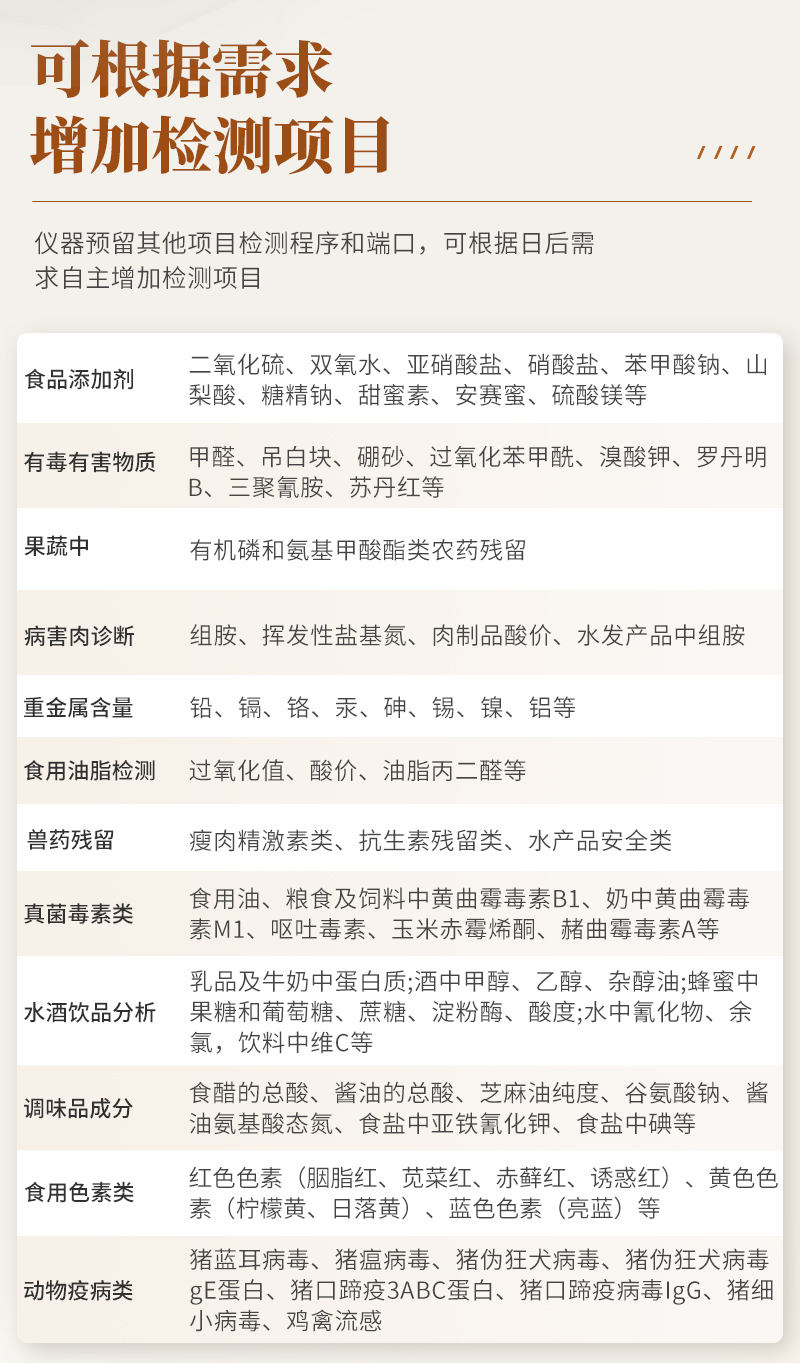 | 食品添加劑:二氧化硫、雙氧水、亞硝酸鹽、硝酸鹽、苯甲酸鈉、山梨酸鉀、糖精鈉、甜蜜素、木耳硫酸鎂等 | 有毒有害物質(zhì):甲醛、吊白塊、硼砂、過(guò)氧化苯甲酰、溴酸鉀、羅丹明B、三聚氰胺、蘇丹紅、工業(yè)堿、尿素、明礬等 | 果蔬:農(nóng)藥殘留(酶抑制率法) | 病害肉診斷:組胺、揮發(fā)性鹽基氮; | 重金屬含量:鉛、鎘、鉻、汞、砷、錫、鎳、鋁等; | 食用油脂: 過(guò)氧化值、酸價(jià)等 | 瘦肉精激素類(獸藥):鹽酸克倫特羅、沙丁胺醇、萊克多巴胺、己烯雌酚等 | 抗生素殘留類(獸藥):四環(huán)素類、硝基呋喃類、磺胺類、β-興奮劑類、沙星類、磺胺類、喹諾酮類,甲砜霉素,氟苯尼考,金剛烷胺、替米考星、慶大霉素、林可霉素、鏈霉素、恩諾沙星、環(huán)丙沙星、頭孢啦啶、青霉素、阿莫西林等 | 真菌毒素類:食用油、糧食及飼料中黃曲霉毒素B1、黃曲霉毒素總量,奶中黃曲霉毒素M1、嘔吐毒素、玉米赤霉烯酮、赭曲霉毒素A、T2毒素、伏馬毒素等; | 水酒飲品分析:酒中甲醇、乙醇、乳品及牛奶中蛋白質(zhì), | 調(diào)味品成分:食醋的總酸、醬油的總酸、芝麻油純度、谷氨酸鈉、醬油氨基酸態(tài)氮、食鹽中亞鐵氰化鉀、食鹽中碘等 | 食用色素類:紅色色素(胭脂紅、莧菜紅、赤蘚紅、誘惑紅)、黃色色素(檸檬黃、日落黃)、藍(lán)色色素(亮藍(lán))等 | 動(dòng)物疫病類:禽流感、新城疫、牛羊口蹄疫、牛羊結(jié)核病、牛羊包蟲、牛羊布病、小反芻獸、豬藍(lán)耳病毒、豬瘟病毒、豬偽狂犬病毒、豬細(xì)小、豬圓環(huán)、犬細(xì)小病毒、犬瘟熱病毒、犬狂犬病毒等; | 蜂蜜成分:果糖和葡萄糖、蔗糖、淀粉酶、酸度等 | 水產(chǎn)品安全類:孔雀石綠、氯霉素、呋喃妥因、呋喃西林、呋喃它酮、呋喃唑酮等 | 蛋類藥物殘留:氯霉素,四環(huán)素,磺胺類,喹諾酮類,呋喃西林,呋喃它酮,呋喃妥因,呋喃唑酮,氟苯尼考,阿莫西林、頭孢氨芐、紅霉素、鏈霉素等 |