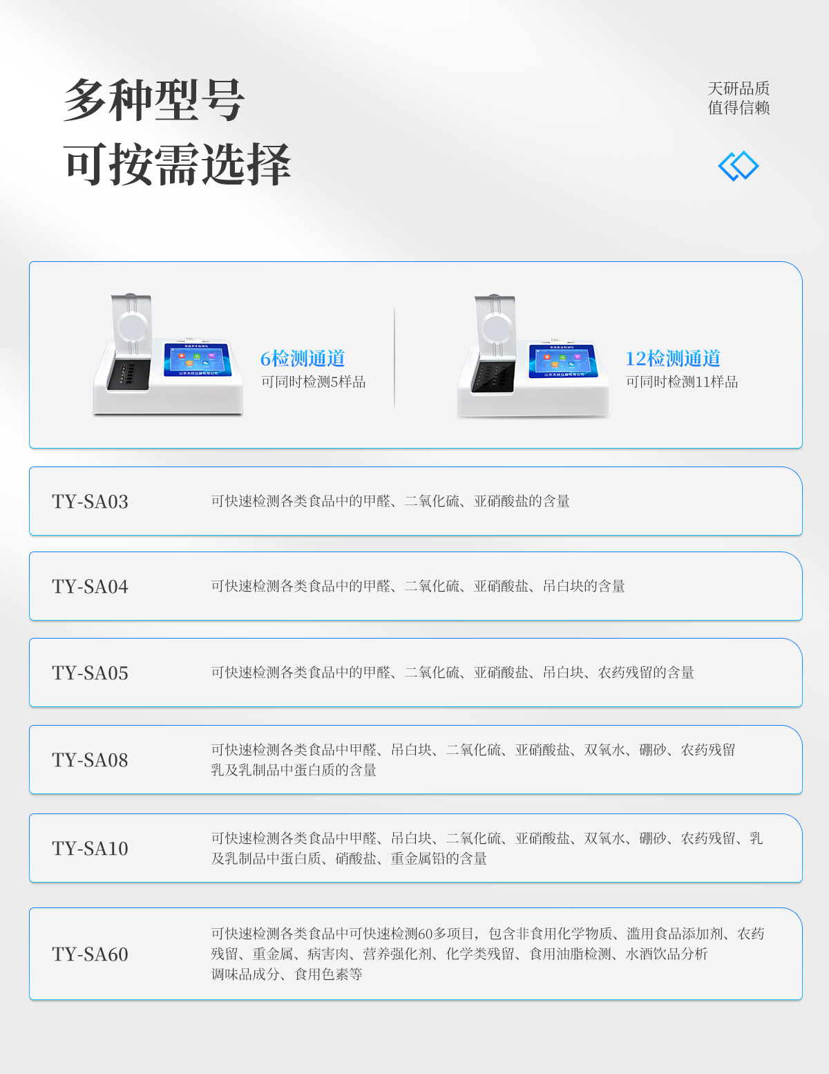 產(chǎn)品描述:產(chǎn)品介紹:多功能食品安全檢測(cè)儀可快速檢測(cè)200多項(xiàng)目,包含非食用化學(xué)物質(zhì)、濫用食品添加劑、農(nóng)藥殘留、獸藥殘留、重金屬、病害肉、營(yíng)養(yǎng)強(qiáng)化劑、抗生素類殘留、激素類殘留、真菌毒素類殘留、化學(xué)類殘留等現(xiàn)場(chǎng)的定性定量檢測(cè)。該多功能食品安全檢測(cè)儀為集成化食品安全快速檢測(cè)分析設(shè)備,廣泛應(yīng)用于市場(chǎng)監(jiān)管局、檢測(cè)中心、衛(wèi)生【詳情】