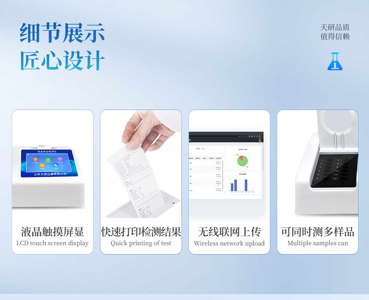 | 安卓智能操作系統(tǒng),采用更加**和人性化操作,儀器具有網(wǎng)線連接、wifi聯(lián)網(wǎng)上傳、GPRS無線遠(yuǎn)傳功能,快速上傳數(shù)據(jù)。 | 智能化程度高,儀器具有自檢功能:具有開機(jī)自檢和調(diào)零功能,具有自動檢測重復(fù)性功能。 | 檢測通道:≥12個(gè)檢測通道,可以同時(shí)測試多個(gè)樣品,每個(gè)樣品由程序控制分別獨(dú)立工作,不會互相干擾。 | 顯示方式:≥8英寸液晶觸摸屏顯示,人性化中文操作界面,讀數(shù)直觀、簡單。 | 配備新一代嵌入式熱敏打印機(jī),可選擇手動打印或者自動打印,檢測完成可自動打印檢測報(bào)告和二維碼。 | 光源采用進(jìn)口超高亮發(fā)光二極管,高精度、穩(wěn)定性強(qiáng)、光源可控、可以關(guān)掉不使用的光源,功耗更低。 | 采用USB2.0接口設(shè)計(jì),方便數(shù)據(jù)的存貯和移動,并可隨時(shí)與計(jì)算機(jī)直接相連,并且可用計(jì)算機(jī)控制儀器。實(shí)現(xiàn)數(shù)據(jù)查詢、瀏覽、分析、統(tǒng)計(jì)、打印等。 | 儀器帶有監(jiān)管平臺。數(shù)據(jù)可局域網(wǎng)和互聯(lián)網(wǎng)數(shù)據(jù)上傳,檢測結(jié)果直接傳至食品安全監(jiān)管平臺。進(jìn)行區(qū)域食品安全監(jiān)管及大數(shù)據(jù)分析處理,檢測區(qū)域食品安全長短期動態(tài),達(dá)到食品安全問題預(yù)估、預(yù)警 | 一體化便攜式快檢設(shè)備,滿足現(xiàn)場及流動檢測使用需求,能夠在同一軟件下實(shí)現(xiàn)所有檢測項(xiàng)目的檢測,并可通過同一窗口直觀顯示檢測結(jié)果。 | 儀器具有多品類多種類樣品菜單庫,可靈活選擇檢測樣品,不同的檢測通道可同時(shí)檢測不同的樣品項(xiàng)目。也可在儀器上直接編輯錄入樣品名稱、檢測指標(biāo)、送檢單位等信息并保存進(jìn)樣品數(shù)據(jù)庫。 | 樣品處理簡單省力,整體操作快速、安全、便捷。 | 儀器具有自身保護(hù)功能,可設(shè)置用戶名及密碼,防止非工作人員操作等。 | 高靈敏度,高檢測精度,高重復(fù)性精度,掃描式高精度光學(xué)傳感器。 | 儀器具有重新校準(zhǔn)、鎖定、恢復(fù)出廠設(shè)置功能。 | 支持U盤存儲。 結(jié)果判定線可修改,對照值標(biāo)定值可保存,斷電不丟失數(shù)據(jù)。 |