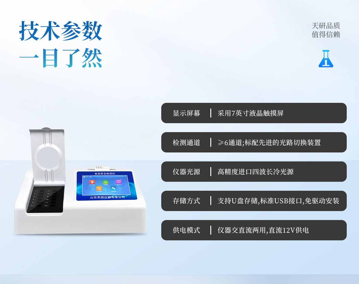 產(chǎn)品描述:產(chǎn)品介紹: 多功能食品安全檢測儀可快速檢測200多項(xiàng)目,包含非食用化學(xué)物質(zhì)、濫用食品添加劑、農(nóng)藥殘留、獸藥殘留、重金屬、病害肉、營養(yǎng)強(qiáng)化劑、抗生素類殘留、激素類殘留、真菌毒素類殘留、化學(xué)類殘留等現(xiàn)場的定性定量檢測。該多功能食品安全檢測儀為集成化食品安全快速檢測分析設(shè)備,廣泛應(yīng)用于市場【詳情】