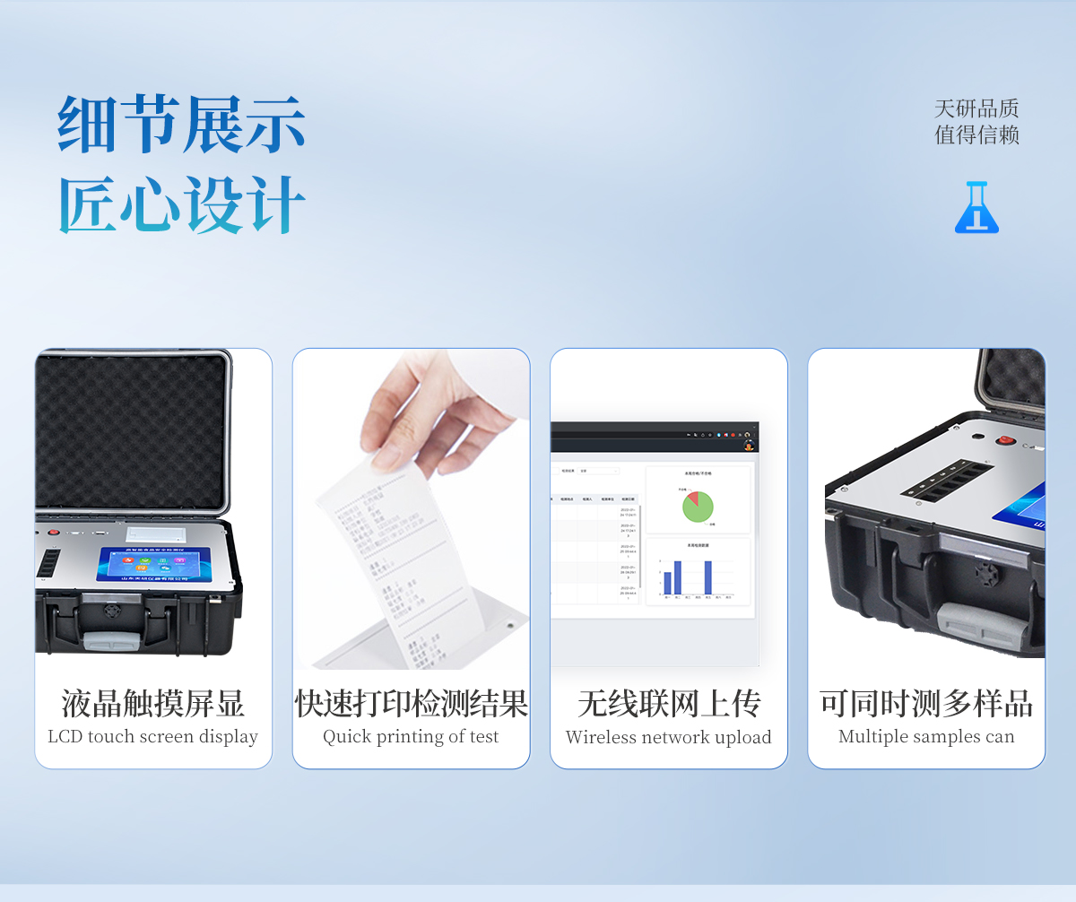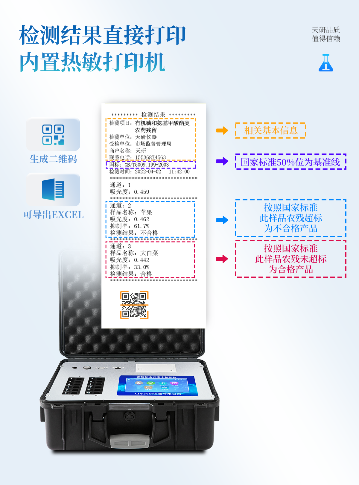 | 安卓智能操作系統(tǒng),采用更加**的UI交互界面,儀器具有wifi聯(lián)網(wǎng)上傳、4G聯(lián)網(wǎng)傳輸、GPRS無線遠(yuǎn)傳、網(wǎng)線連接功能,快速批量上傳數(shù)據(jù)。 | 智能化程度高,儀器具有自檢功能:具有開機(jī)自檢和調(diào)零功能,具有自動檢測重復(fù)性功能。 | 新一代高速熱敏打印機(jī),檢測完成可自動打印或批量打印檢測報告和二維碼。 | 儀器帶有監(jiān)管平臺,數(shù)據(jù)可局域網(wǎng)和互聯(lián)網(wǎng)數(shù)據(jù)上傳,檢測結(jié)果直接傳至食品安全監(jiān)管平臺。進(jìn)行區(qū)域食品安全監(jiān)管及大數(shù)據(jù)分析處理與數(shù)據(jù)統(tǒng)計(jì),檢測區(qū)域食品安全長短期動態(tài),達(dá)到食品安全問題預(yù)估、預(yù)警 | 一體化主機(jī),包含食品安全檢測模塊、多通道農(nóng)藥殘留檢測模塊、膠體金免疫層析檢測模塊。 | 一體化便攜式快檢設(shè)備,滿足現(xiàn)場及流動檢測使用需求,能夠在同一軟件下實(shí)現(xiàn)所有檢測項(xiàng)目的檢測,并可通過同一窗口直觀顯示檢測結(jié)果。 | 膠體金模塊檢測方式:軌道式自動傳輸掃描,檢測完成后自動退出檢測卡。 | CT線自動識別,無需手動調(diào)整。 | 內(nèi)置強(qiáng)大的數(shù)據(jù)庫,具有多品類多種類樣品菜單功能,可靈活選擇檢測樣品,不同的檢測通道可同時檢測不同的樣品項(xiàng)目。也可在儀器上直接編輯錄入樣品名稱、檢測指標(biāo)、送檢單位等信息并保存進(jìn)樣品數(shù)據(jù)庫。 | 產(chǎn)品內(nèi)置操作演示視頻,是您身邊的化驗(yàn)指導(dǎo)專家。 | 樣品處理簡單省力,整體操作快速、安全、便捷。 | 儀器具有自身保護(hù)功能,可設(shè)置用戶名及密碼,防止非工作人員操作等。 | 高靈敏度,高檢測精度,高重復(fù)性精度,掃描式高精度光學(xué)傳感器。 | 結(jié)果判定線可修改,對照值標(biāo)定值可保存,斷電不丟失數(shù)據(jù)。 | 兼容市場上所有的膠體金卡,使用耗材不受限制,極大增強(qiáng)用戶使用體驗(yàn)。 | 儀器具有重新校準(zhǔn)、鎖定、恢復(fù)出廠設(shè)置功能。 |