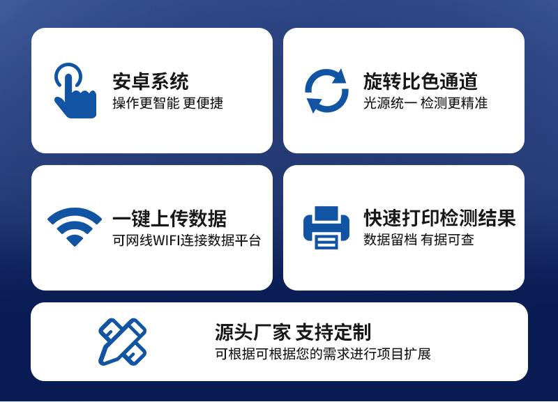 | 安卓智能操作系統(tǒng),采用更加**和人性化操作,儀器具有無(wú)線(xiàn)聯(lián)網(wǎng)上傳功能,快速上傳數(shù)據(jù),進(jìn)行數(shù)據(jù)統(tǒng)計(jì)和分析。 | 智能化程度高,儀器具有自檢功能:具有開(kāi)機(jī)自檢和調(diào)零功能,具有自動(dòng)檢測(cè)重復(fù)性功能;同時(shí),檢測(cè)完成可自動(dòng)打印檢測(cè)報(bào)告和二維碼。手機(jī)掃碼可顯示出詳細(xì)檢測(cè)信息。 | 儀器帶有監(jiān)管平臺(tái),數(shù)據(jù)可局域網(wǎng)和互聯(lián)網(wǎng)數(shù)據(jù)上傳,檢測(cè)結(jié)果直接傳至食品安全監(jiān)管平臺(tái)。進(jìn)行區(qū)域食品安全監(jiān)管及大數(shù)據(jù)分析處理與數(shù)據(jù)統(tǒng)計(jì),檢測(cè)區(qū)域食品安全長(zhǎng)短期動(dòng)態(tài),達(dá)到食品安全問(wèn)題預(yù)估、預(yù)警 。 | 樣品處理簡(jiǎn)單省力,整體操作快速、安全、便捷。 | 儀器具有自身保護(hù)功能,可設(shè)置用戶(hù)名及密碼,防止非工作人員操作等。 | 內(nèi)置強(qiáng)大的數(shù)據(jù)庫(kù),可在儀器上直接選擇樣品名稱(chēng)、檢測(cè)指標(biāo)、送檢單位等信息,也可在儀器上直接編輯錄入樣品名稱(chēng)、檢測(cè)指標(biāo)、送檢單位等信息并保存進(jìn)樣品數(shù)據(jù)庫(kù),方便后期操作調(diào)取使用。 | 儀器具有重新校準(zhǔn)、鎖定、恢復(fù)出廠(chǎng)設(shè)置功能。 |