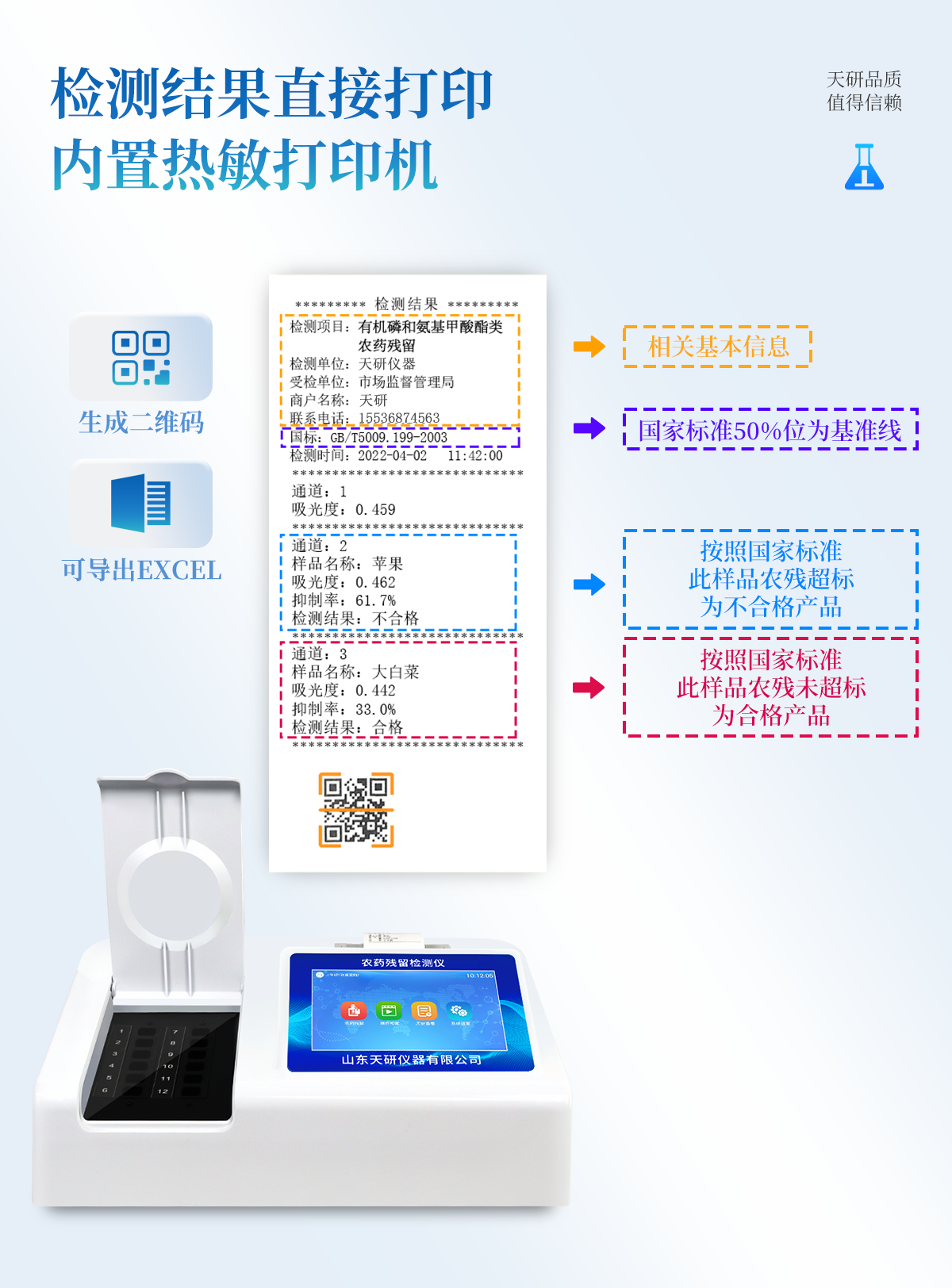 | 乙酰膽堿酯酶和丁酰膽堿酯酶試劑均可以使用,符合國家標(biāo)準(zhǔn)和農(nóng)業(yè)部標(biāo)準(zhǔn)的要求。 | 自動(dòng)判斷樣品是否合格,檢測(cè)結(jié)果更加直觀。 | 儀器具有100多種蔬菜名稱菜單庫,分類管理,并可按需添加或刪除蔬菜名,編輯蔬菜名稱,可直接打印出蔬菜名稱。 | 檢測(cè)通道:16個(gè)檢測(cè)通道,可以同時(shí)測(cè)試多個(gè)樣品,循環(huán)檢測(cè),即放即檢,每個(gè)樣品由程序控制分別獨(dú)立工作,不會(huì)互相干擾。 | 智能操作系統(tǒng),采用更加人性化操作,主控采用多核處理器,主頻1.88Ghz,運(yùn)轉(zhuǎn)速度更快速,穩(wěn)定性更強(qiáng)。 | 顯示方式:7英寸高靈敏真彩觸摸屏顯示,人性化中文操作界面,讀數(shù)直觀、簡單。 | 打印機(jī)采用串口5v打印,可選擇手動(dòng)打印或者自動(dòng)打印,三分鐘出打印結(jié)果,打印格式為檢測(cè)人姓名、吸光度差值、檢測(cè)時(shí)間、檢測(cè)機(jī)構(gòu)、樣品名稱及結(jié)果判定。 | 光源采用進(jìn)口超高亮發(fā)光二極管,具有低功耗、高精度、穩(wěn)定性強(qiáng)、光源可控可以關(guān)掉不使用的光源,響應(yīng)速度快等優(yōu)點(diǎn)。 | 智能恒流穩(wěn)壓,光強(qiáng)自動(dòng)校準(zhǔn),長時(shí)間連續(xù)工作光源無溫漂現(xiàn)象。 | 儀器具有GPRS遠(yuǎn)傳功能,可插手機(jī)卡實(shí)現(xiàn)數(shù)據(jù)遠(yuǎn)傳平臺(tái),wifi聯(lián)網(wǎng)功能,可將數(shù)據(jù)快速上傳電腦,進(jìn)行數(shù)據(jù)管理與統(tǒng)計(jì)。 | 采用USB2.0接口設(shè)計(jì),方便數(shù)據(jù)的存貯和移動(dòng),并可隨時(shí)與計(jì)算機(jī)直接相連,并且可用計(jì)算機(jī)控制儀器。實(shí)現(xiàn)數(shù)據(jù)查詢、瀏覽、分析、統(tǒng)計(jì)、打印等。 | 智能化程度高,儀器具有自檢功能:具有開機(jī)自檢和調(diào)零功能,具有自動(dòng)檢測(cè)重復(fù)性功能 | 儀器具有自身保護(hù)功能,可設(shè)置用戶名及密碼,防止非工作人員操作等。 | 采用DC12v直流供電,安全系統(tǒng)更高,并且配備6A鋰電池充電器。 | 儀器具有重新校準(zhǔn)、鎖定、恢復(fù)出廠設(shè)置功能。 |