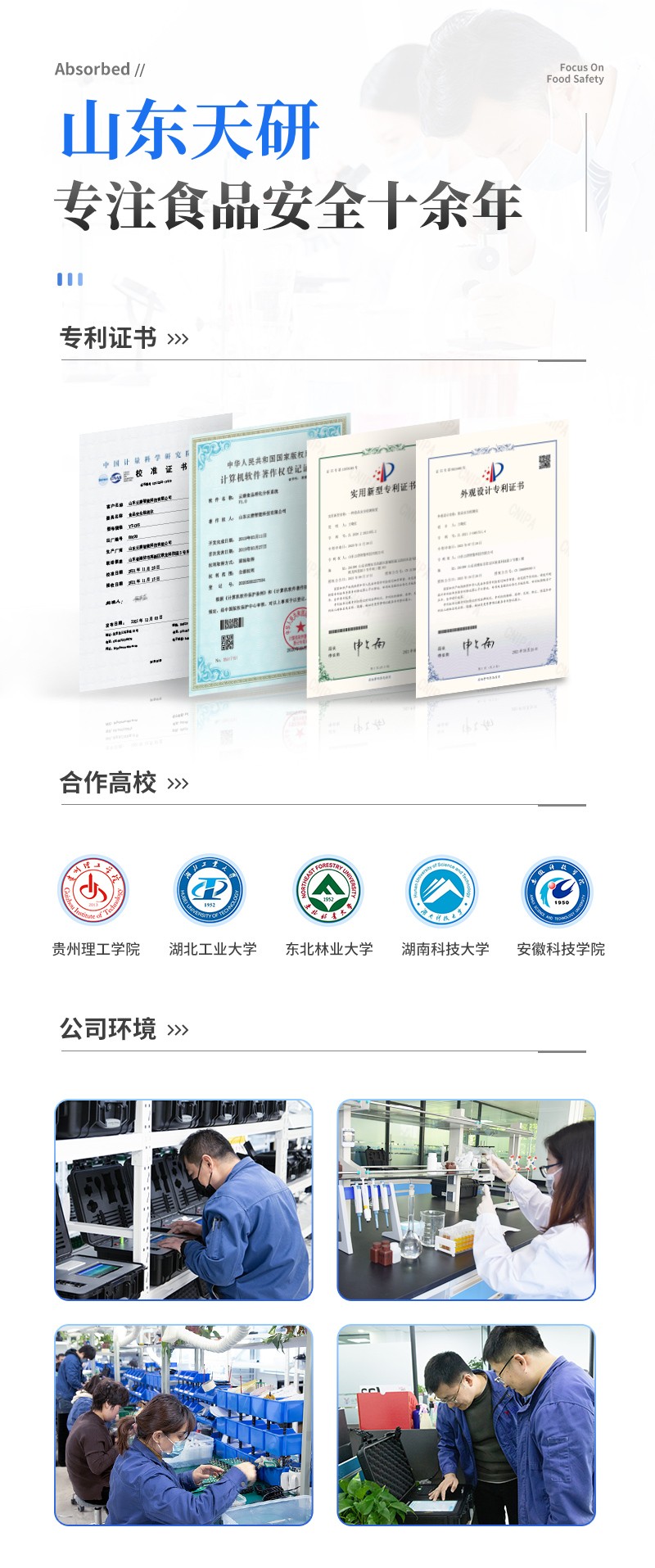 | 儀器采用臺式一體化系統(tǒng)檢測技術(shù),將分光光度模塊、新型農(nóng)殘檢測模塊、數(shù)字化管理模塊、無線通訊模塊高度集成于一體,支持檢測200種食品安全檢測項目,同時預留升級檢測方法。 | 儀器檢測模塊標準化、智能化,可隨意自由組合。檢測箱體內(nèi)置多個標準檢測單元,檢測模塊可以調(diào)整配置。 | 儀器采用全新安卓智能系統(tǒng),主控芯片采用 ARM Cortex-A7,RK3288/4核處理器,10.1寸高清液晶觸摸豎屏,更加**的UI交互界面,運轉(zhuǎn)快捷;儀器配備無線通信模塊: 4G(APN)通訊模塊、Wifi模塊,藍牙傳輸,同時具有雙USB接口以及RJ45接口能以多種方式實現(xiàn)數(shù)據(jù)保存和數(shù)據(jù)傳輸功能。 | 創(chuàng)新檢測模式: | ★檢測通道:≥12通道;采用精密旋轉(zhuǎn)比色池設(shè)計,使用同芯片同光源校準精度,解決不同光源之間的誤差值。1-12通道間誤差0.1%。(**號:ZL202022821055.2) | ★儀器具有自動識別比色皿檢測功能,即:將樣品比色皿放入儀器后,點擊樣品檢測,儀器自動識別比色皿進行通道檢測。 | 進口高精光源: | 高精度進口四波長冷光源,通道配置 410、520、590、630nm 波長光源,一個光源芯片驅(qū)動一個光源,誤差極小,每臺設(shè)備單獨**校準光源,**比對,同時參照四種不同波段光源全方位覆蓋市面上99%的農(nóng)殘食品項目檢測。 | 智能化操作系統(tǒng): | 便捷操作系統(tǒng):設(shè)備檢測時可在同一檢測界面自動對應相關(guān)檢測通道一次性選擇1-12個樣品名稱,無須退出界面,節(jié)省操作時間。 | 數(shù)據(jù)集成系統(tǒng):設(shè)備首頁自動統(tǒng)計檢測數(shù)據(jù)包含:周檢測數(shù)據(jù)、月檢測數(shù)據(jù),全部檢測總數(shù)量,均包含檢測總數(shù),合格數(shù),不合格數(shù),以及相關(guān)柱形分析圖,對各項檢測數(shù)據(jù)清晰掌握,無需電腦查詢,更加快捷直觀。 | 項目預設(shè)系統(tǒng):支持添加單個及多個相同或不相同的任務預設(shè),一鍵快速調(diào)取,每一個任務分別可以設(shè)置不同的樣品、批次、編號、來源、備注、抽樣信息、檢測信息、受檢信息、復核信息等更多信息。無縫鏈接平臺和APP實時查看下發(fā)任務。 | 數(shù)據(jù)監(jiān)管系統(tǒng):同步對接監(jiān)管平臺,數(shù)據(jù)可局域網(wǎng)和互聯(lián)網(wǎng)數(shù)據(jù)上傳,檢測結(jié)果可選擇直接傳至食品安全監(jiān)管平臺。集成OSS輸出存儲服務、區(qū)分設(shè)備定向管理應用,進行區(qū)域食品安全監(jiān)管及大數(shù)據(jù)分析處理與數(shù)據(jù)統(tǒng)計,檢測區(qū)域食品安全長短期動態(tài),達到食品安全問題預估、預警。 | 自定義打印系統(tǒng):內(nèi)置全新打印系統(tǒng),新創(chuàng)自定義打印方式,可按需靈活設(shè)置開啟或關(guān)閉:產(chǎn)品合格證(國家農(nóng)業(yè)部標準要求),二維碼,抽樣信息、檢測信息,受檢信息、復核信息、抽樣日期、檢測日期等信息的打印。 | 系統(tǒng)遠程更新功能:可定向分客戶分儀器更新系統(tǒng),按照不同客戶后期實際需求添加項目,無需機器返廠,即可遠程實時升級全新系統(tǒng),節(jié)省時間成本及避免運輸造成設(shè)備損壞。 | 儀器主機采用一體化防水、抗壓、防撞擊、防腐蝕箱體設(shè)計,同時配備交直流供電,可連接車載電源,可選配大容量充電鋰電池,滿足現(xiàn)場野外檢測需求。 | 安全證書,放心保障:儀器具有中國計量科學研究院校準證書,**認證。 |