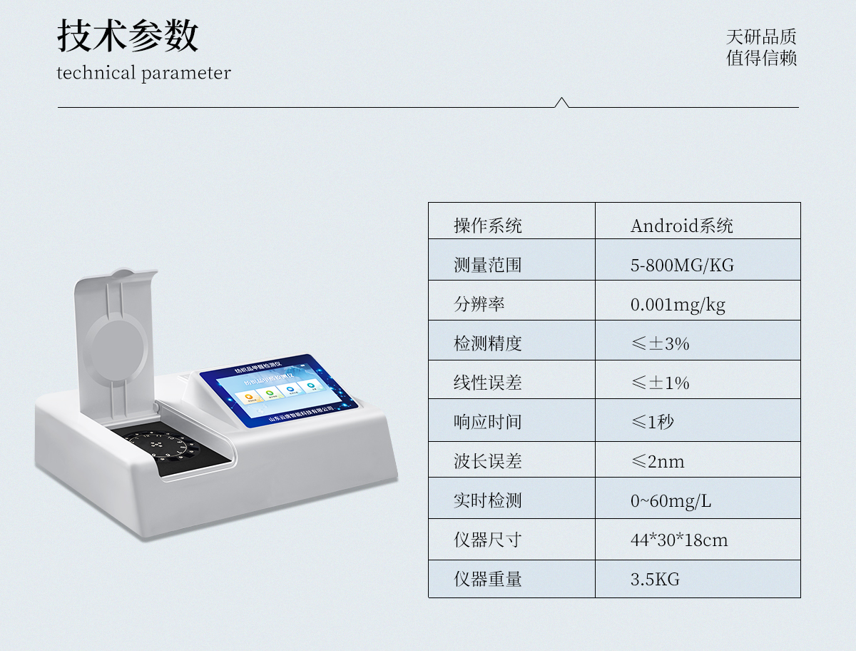 | 1、智能**且方便 | ①智能芯片:主控芯片采用ARM Cortex-A7,RK3288/4核處理器,搭配安卓智能操作系統(tǒng),集實(shí)驗(yàn)操作,分析結(jié)果,打印報(bào)告等功能于一體,使用方便,性能更強(qiáng)。 | ②大屏顯示:采用10.1英寸液晶觸摸屏,單機(jī)即可操作,無(wú)需連接外部顯示或控制器。 | ③多樣同檢:儀器具有12個(gè)檢測(cè)通道,可同時(shí)一次性檢測(cè)11個(gè)樣品,效率更高。 | ④工作預(yù)設(shè):具有任務(wù)預(yù)設(shè)模塊,一鍵提前預(yù)設(shè)樣品所有信息內(nèi)容。來(lái)樣時(shí)可直接檢測(cè),同時(shí)可多次調(diào)取。 | ⑤數(shù)據(jù)分析:設(shè)備首頁(yè)自動(dòng)匯總分析數(shù)據(jù),并繪制柱形分析圖,各項(xiàng)檢測(cè)數(shù)據(jù)一目了然,快捷直觀。 | ⑥高度集成:模塊高度集合,將分光光度模塊、數(shù)字化管理模塊、無(wú)線通訊模塊集成于一體??蓪z測(cè)結(jié)果進(jìn)行分析,直接上傳至數(shù)據(jù)平臺(tái),實(shí)現(xiàn)數(shù)據(jù)共享,方便后期進(jìn)行數(shù)據(jù)分析與統(tǒng)計(jì)。 | ⑦遠(yuǎn)程升級(jí):儀器具備遠(yuǎn)程升級(jí)功能,可遠(yuǎn)程升級(jí)程序,無(wú)需返廠,并可持續(xù)性免費(fèi)更新系統(tǒng)版本,降低成本及運(yùn)輸損耗風(fēng)險(xiǎn)。 | 2、檢測(cè)精準(zhǔn)且直觀 | ①**技術(shù):精密旋轉(zhuǎn)比色池,使用同芯片同光源校準(zhǔn)精度,解決不同光源之間存在波長(zhǎng)誤差的問題,更加準(zhǔn)確**。 | ②結(jié)果直觀:儀器自動(dòng)對(duì)檢測(cè)結(jié)果與國(guó)標(biāo)限量值進(jìn)行對(duì)比,自動(dòng)判定結(jié)果是否合格,結(jié)果更直觀。 | 3、功能強(qiáng)大且實(shí)用 | ①存儲(chǔ)功能:設(shè)備可以存儲(chǔ)數(shù)據(jù)100000組,可在屏幕上直觀查看歷史數(shù)據(jù),可導(dǎo)出數(shù)據(jù)。 | ②打印功能:設(shè)備自帶打印功能,可對(duì)樣品信息及檢測(cè)結(jié)果無(wú)限次隨意打印。 | ③全新方式:新創(chuàng)自定義打印方式,可按需靈活勾選控制:二維碼,抽樣信息、檢測(cè)信息,受檢信息、復(fù)核信息、抽樣日期、檢測(cè)日期等信息的打印 | ④多重編輯:樣品信息可多重編輯,可以對(duì)每個(gè)通道屬性和樣品信息單獨(dú)進(jìn)行編輯,例如樣品信息、抽樣信息、檢測(cè)信息,受檢信息、復(fù)核信息、抽樣日期、檢測(cè)日期等信息等。 | ⑤雙語(yǔ)設(shè)計(jì):全中文/英文操作菜單,簡(jiǎn)單實(shí)用,適用于不同用戶的需求。 |