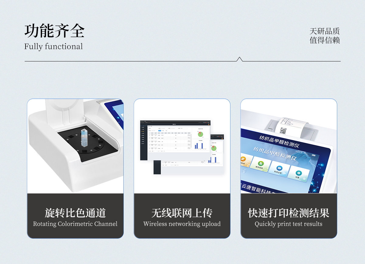 本套紡織品甲醛檢測(cè)設(shè)備滿足紡織品甲醛含量檢測(cè)的中國(guó)標(biāo)準(zhǔn)《國(guó)家紡織產(chǎn)品基本安全技術(shù)規(guī)范》(GB 18401-2010)、《紡織品·甲醛的測(cè)定·第1部分:游離和水解的甲醛(水萃取法)》(GB/T 2912.1-2009), 適合各種紡織品、服裝等的甲醛含量檢測(cè)。