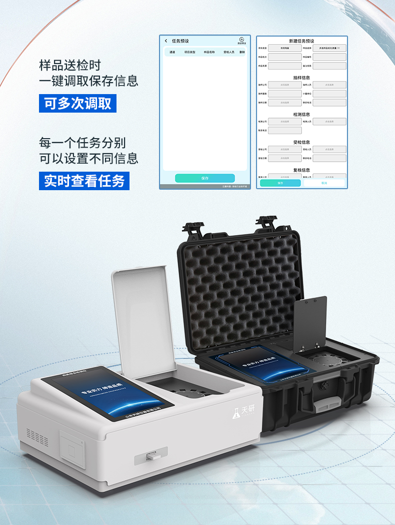 | 儀器采用手提式一體化系統(tǒng)檢測(cè)技術(shù),將分光光度模塊、膠體金檢測(cè)模塊、新型農(nóng)殘檢測(cè)模塊、數(shù)字化管理模塊、無線通訊模塊高度集成于一體,支持檢測(cè)200種食品安全檢測(cè)項(xiàng)目,同時(shí)預(yù)留升級(jí)檢測(cè)方法。 | 儀器檢測(cè)模塊標(biāo)準(zhǔn)化、智能化,檢測(cè)項(xiàng)目可隨意自由組合。檢測(cè)箱體內(nèi)置多個(gè)標(biāo)準(zhǔn)檢測(cè)單元,檢測(cè)模塊可以調(diào)整配置。 | 顯示屏幕:儀器采用10.1英寸豎向液晶觸摸屏顯,搭配運(yùn)行安卓智能操作系統(tǒng),主控芯片采用ARM Cortex-A7,RK3288/4核處理器,主頻1.88Ghz,操作方便,性能更強(qiáng)。 | 檢測(cè)通道:≥12通道;采用精密旋轉(zhuǎn)比色池設(shè)計(jì),使用同芯片同光源校準(zhǔn)精度,解決不同光源之間的誤差值,更加準(zhǔn)確**。(1-12通道間誤差0.1%,**號(hào):ZL202022821055.2) | 儀器光源:高精度進(jìn)口四波長(zhǎng)冷光源,每個(gè)通道均配置 410、520、590、630nm 波長(zhǎng)光源,標(biāo)配**的光路切換裝置,**光路切換功能可實(shí)現(xiàn)64波長(zhǎng),并且所有檢測(cè)項(xiàng)目可實(shí)現(xiàn)所有通道同時(shí)檢測(cè)。 | 設(shè)備可一鍵校準(zhǔn),自動(dòng)保存校準(zhǔn)數(shù)據(jù),自動(dòng)對(duì)比校驗(yàn),得到精準(zhǔn)光源,采用Android SP存儲(chǔ)數(shù)據(jù),光源數(shù)據(jù)永不丟失,方便每一次使用。 | 通訊接口:配備無線通信模塊、4G(APN)通訊模塊、藍(lán)牙傳輸,同時(shí)具有雙USB接口以及RJ45網(wǎng)線接口,可以多方式實(shí)現(xiàn)數(shù)據(jù)保存及數(shù)據(jù)傳輸 | 存儲(chǔ)方式:支持U盤存儲(chǔ),標(biāo)準(zhǔn)USB接口,免驅(qū)動(dòng)安裝。檢測(cè)結(jié)果存儲(chǔ)容量20萬條以上,可生成Excel表格進(jìn)行拷貝,并具有登錄保護(hù)功能。 | 智能化操作系統(tǒng): | 1)操作系統(tǒng):儀器可在同一檢測(cè)界面自動(dòng)對(duì)應(yīng)相關(guān)檢測(cè)通道,一次性選擇1-12個(gè)樣品名稱,無需退出界面,節(jié)省操作時(shí)間。并可以對(duì)每個(gè)通道屬性和樣品信息單獨(dú)進(jìn)行編輯,例如送檢單位、人員,檢測(cè)人員等,打印時(shí)勾選打印顯示。 | 2)數(shù)據(jù)集成系統(tǒng):設(shè)備首頁(yè)自動(dòng)匯總分析檢測(cè)數(shù)據(jù),包含:周檢測(cè)數(shù)據(jù)、月檢測(cè)數(shù)據(jù),全部檢測(cè)總數(shù)量,均包含檢測(cè)總數(shù),合格數(shù),不合格數(shù),以及相關(guān)柱形分析圖,各項(xiàng)檢測(cè)數(shù)據(jù)一目了然,無需電腦查詢,更加快捷直觀。 | 3)數(shù)據(jù)庫(kù)系統(tǒng):十幾項(xiàng)數(shù)據(jù)庫(kù)分類管理儀器:包含項(xiàng)目類型、項(xiàng)目數(shù)據(jù)、檢測(cè)數(shù)據(jù)、歷史記錄、國(guó)標(biāo)信息、曲線信息、采樣信息、檢測(cè)信息、受檢信息、復(fù)核信息、圖表信息、光源校準(zhǔn)信息、打印樣式信息、樣品庫(kù)信息等等,數(shù)據(jù)庫(kù)之間互相協(xié)調(diào)聯(lián)動(dòng)保證數(shù)據(jù)的真實(shí)完整性。同時(shí)產(chǎn)品數(shù)據(jù)庫(kù)以及歷史檢測(cè)記錄支持一鍵檢索功能。 | 4)限量規(guī)判系統(tǒng):具有限量查詢、添加物質(zhì)合規(guī)判定系統(tǒng)。檢測(cè)出結(jié)果后,系統(tǒng)自動(dòng)調(diào)用系統(tǒng)數(shù)據(jù)庫(kù)中相關(guān)國(guó)標(biāo)進(jìn)行比對(duì)判定,客觀顯示判定結(jié)果是否合格。 | 5)項(xiàng)目預(yù)設(shè)系統(tǒng):儀器具有任務(wù)預(yù)設(shè)模塊,一鍵提前預(yù)設(shè),給出方便快捷的新檢測(cè)方案,每一個(gè)任務(wù)分別可以設(shè)置不同的樣品、批次、編號(hào)、來源、備注、抽樣信息、檢測(cè)信息、受檢信息、復(fù)核信息等更多信息。樣品送檢時(shí)一鍵調(diào)取保存信息,并可多次調(diào)取,大大提高檢測(cè)效率。 | 6)數(shù)據(jù)監(jiān)管系統(tǒng):同步對(duì)接監(jiān)管平臺(tái),數(shù)據(jù)可局域網(wǎng)和互聯(lián)網(wǎng)數(shù)據(jù)上傳,檢測(cè)結(jié)果可選擇直接傳至食品安全監(jiān)管平臺(tái)。進(jìn)行區(qū)域食品安全監(jiān)管及大數(shù)據(jù)分析處理與數(shù)據(jù)統(tǒng)計(jì),檢測(cè)區(qū)域食品安全長(zhǎng)短期動(dòng)態(tài),達(dá)到食品安全問題預(yù)估、預(yù)警。 | 7)打印系統(tǒng):內(nèi)置全新打印機(jī),新創(chuàng)自定義打印方式,可按需靈活勾選控制:產(chǎn)品合格證(國(guó)家農(nóng)業(yè)部標(biāo)準(zhǔn)要求),二維碼,抽樣信息、檢測(cè)信息,受檢信息、復(fù)核信息、抽樣日期、檢測(cè)日期等信息的打印。 | 供電模式:儀器交直流兩用,直流12V供電,可連接車載電源,可配6ah大容量充電鋰電池,電量可實(shí)時(shí)顯示,方便戶外流動(dòng)測(cè)試。 | 膠體金檢測(cè)模塊:采用雙通道CMOS成像處理技術(shù)及膠體金免疫層析技術(shù),可同時(shí)讀取雙膠體金卡數(shù)據(jù),自動(dòng)采集、處理分析,將檢測(cè)結(jié)果顯示,并可根據(jù)參考限值自動(dòng)判斷檢測(cè)結(jié)果,可檢測(cè)常見的獸藥殘留、生物毒素、抗生素、違禁添加物等。 | 1)探測(cè)技術(shù):CMOS成像探測(cè); | 2)檢測(cè)通道:1個(gè)通道; | 3)檢測(cè)方式:消線法和比色法; | 4)顯示模式:陰性或陽(yáng)性; | 5)曲線形式
