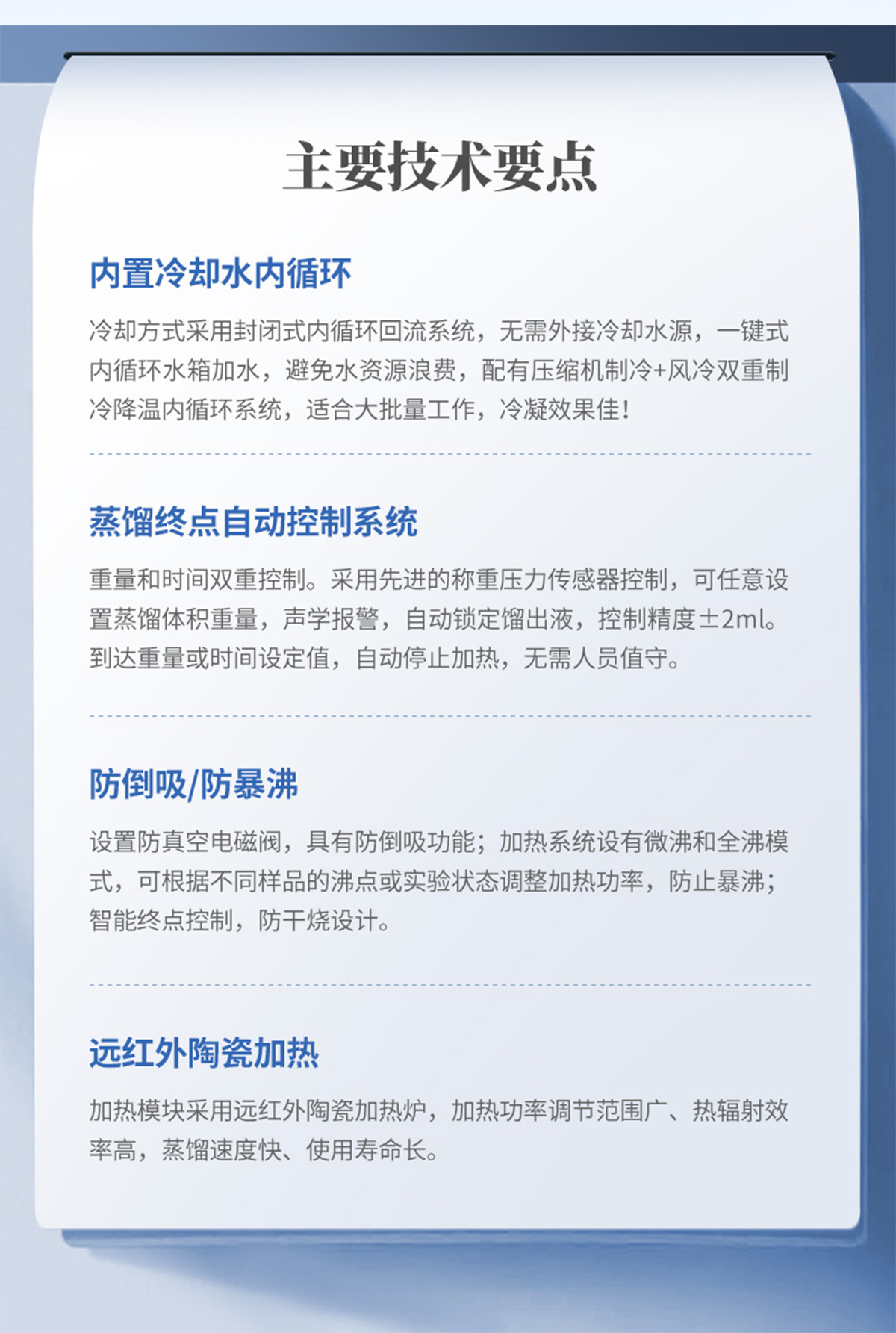 | 1、加熱方式:采用遠紅外陶瓷加熱爐,紅外線輻射加熱(無明火加熱、防水); | 2、加熱單元:6個,可單孔單控制; | 3、升溫時間:5-8min; | 4、蒸餾速度:2-12ml/min; | 5、蒸餾終點控制:自動偵測蒸餾終點功能,采用稱重和時間雙重控制,蒸餾體積控制在±2ml之內(nèi),自動化程度高; | 6、單爐加熱功率:0-450W(單孔可調(diào)); | 7、加熱功率:0-2700W(可調(diào)); | 8、冷卻方式:封閉式內(nèi)循環(huán)回流系統(tǒng),也可外接冷卻水源; | 9、防倒吸:設(shè)有防真空電磁閥,具有防倒吸功能; | 10、時間控制:0-200min可調(diào); | 11、蒸餾瓶規(guī)格:500mlX6,250 X6 更多規(guī)格可選; | 12、額定電壓/頻率:220V/50HZ; |