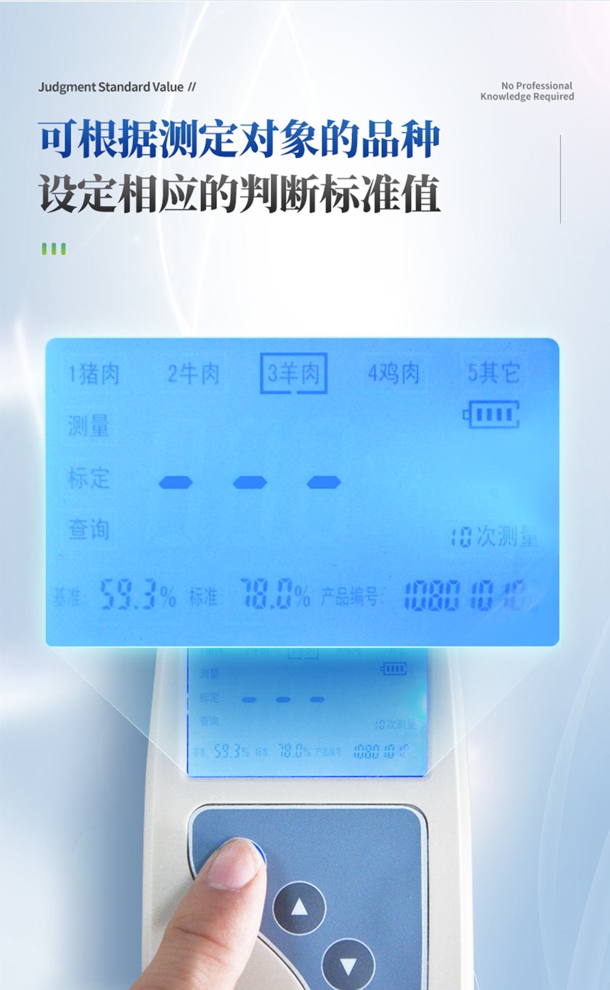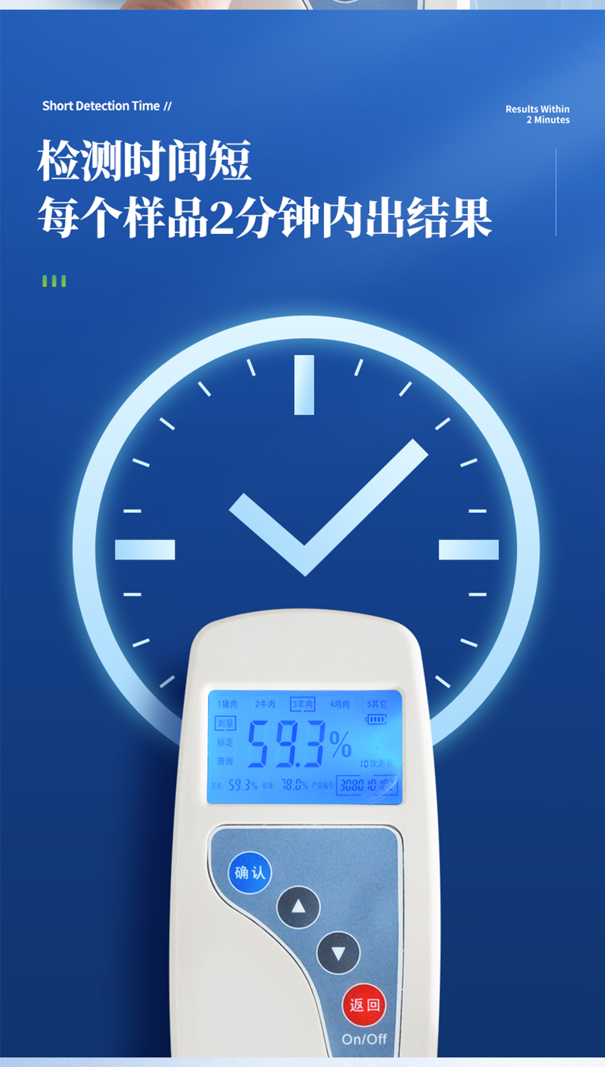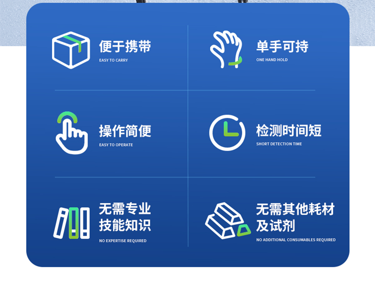 | 便于攜帶,單手可持 | 可根據(jù)測(cè)定對(duì)象的品種,設(shè)定相應(yīng)的判斷標(biāo)準(zhǔn)值 | 操作簡(jiǎn)便,檢測(cè)人員無需專業(yè)技能知識(shí) | 檢測(cè)時(shí)間短,每個(gè)樣品2分鐘內(nèi)出結(jié)果; | 檢測(cè)試驗(yàn)無需其他耗材及試劑 |