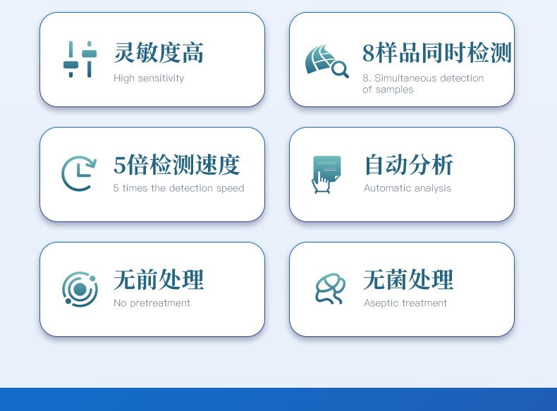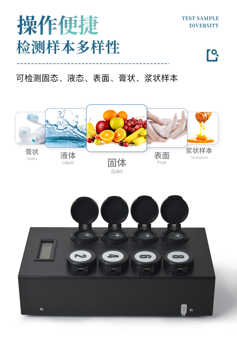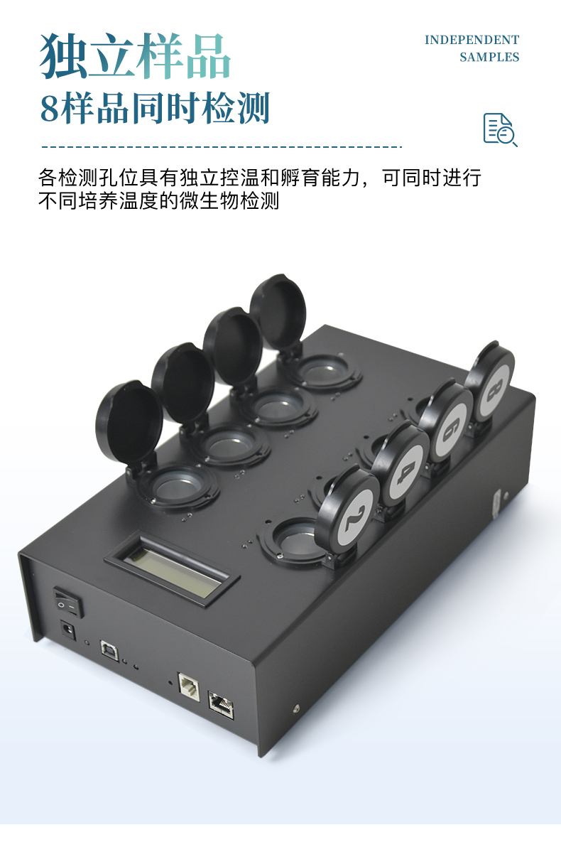 4、 檢測樣本只需1ml/1g;同一溫度下可同時(shí)檢測8個(gè)樣品;