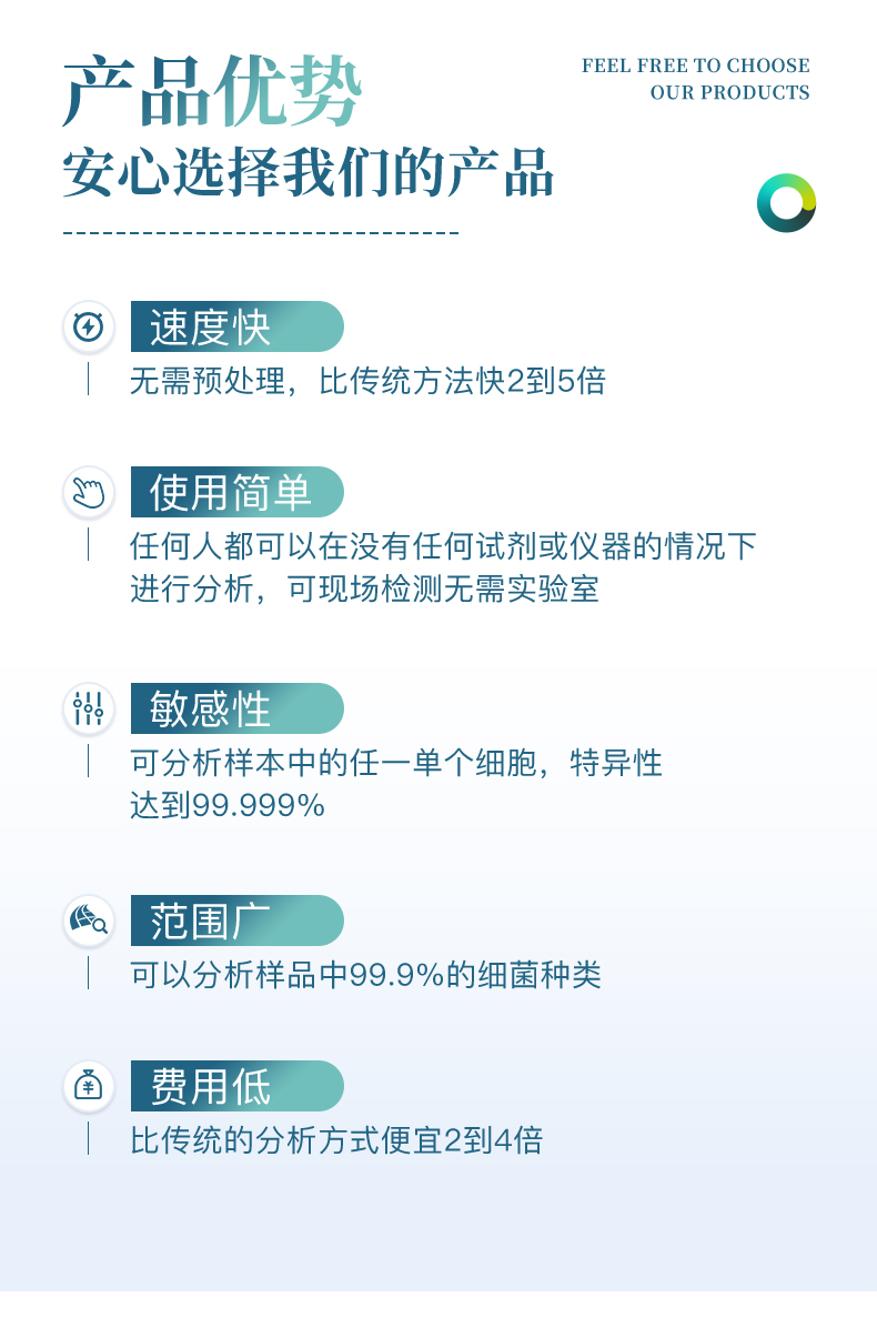 5、 靈敏度高達(dá)可檢測到1目標(biāo)微生物;特異性高達(dá)99.999%;