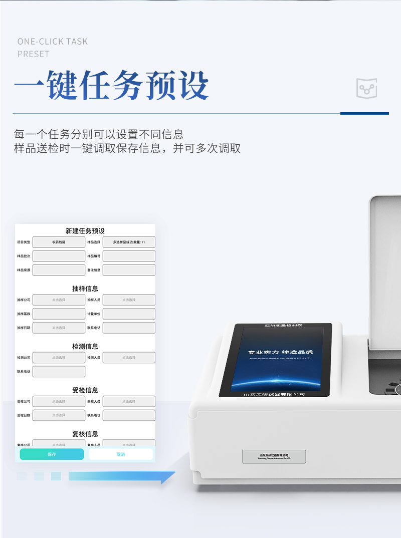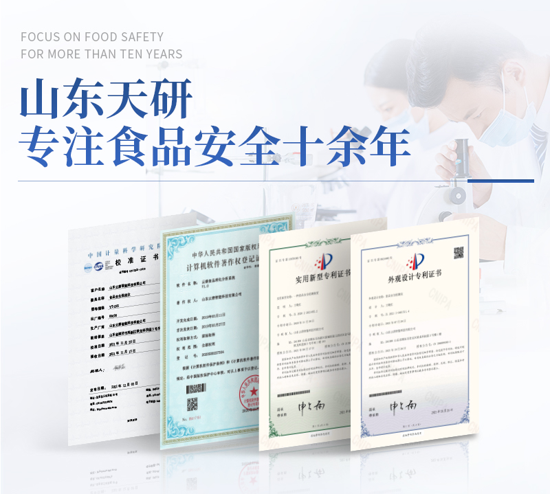 | 儀器采用臺式一體化系統(tǒng)檢測技術(shù),將分光光度模塊、數(shù)字化管理模塊、無線通訊模塊高度集成于一體,可支持檢測60種食品安全檢測項(xiàng)目,同時預(yù)留升級檢測方法。 | 儀器檢測模塊標(biāo)準(zhǔn)化、智能化,檢測項(xiàng)目可隨意自由組合。檢測箱體內(nèi)置多個標(biāo)準(zhǔn)檢測單元,檢測模塊可以調(diào)整配置。 | 顯示屏幕:儀器采用10.1英寸豎向液晶觸摸屏顯,搭配運(yùn)行安卓智能操作系統(tǒng),主控芯片采用ARM Cortex-A7,RK3288/4核處理器,主頻1.88Ghz,操作方便,性能更強(qiáng)。 | 檢測通道:≥12通道;采用精密旋轉(zhuǎn)比色池設(shè)計,使用同芯片同光源校準(zhǔn)精度,解決不同光源之間的誤差值,更加準(zhǔn)確**。(1-12通道間誤差0.1%,**號:ZL202022821055.2) | 儀器光源:高精度進(jìn)口四波長冷光源,每個通道均配置 410、520、590、630nm 波長光源,標(biāo)配**的光路切換裝置,**光路切換功能可實(shí)現(xiàn)64波長,并且所有檢測項(xiàng)目可實(shí)現(xiàn)所有通道同時檢測。 | 設(shè)備可一鍵校準(zhǔn),自動保存校準(zhǔn)數(shù)據(jù),自動對比校驗(yàn),得到精準(zhǔn)光源,采用Android SP存儲數(shù)據(jù),光源數(shù)據(jù)永不丟失,方便每一次使用。 | 通訊接口:配備無線通信模塊、4G(APN)通訊模塊、藍(lán)牙傳輸,同時具有雙USB接口以及RJ45網(wǎng)線接口,可以多方式實(shí)現(xiàn)數(shù)據(jù)保存及數(shù)據(jù)傳輸。 | 存儲方式:支持U盤存儲,標(biāo)準(zhǔn)USB接口,免驅(qū)動安裝。檢測結(jié)果存儲容量20萬條以上,可生成Excel表格進(jìn)行拷貝,并具有登錄保護(hù)功能。 | 智能化操作系統(tǒng): | 1、操作系統(tǒng):儀器可在同一檢測界面自動對應(yīng)相關(guān)檢測通道,一次性選擇1-12個樣品名稱,無需退出界面,節(jié)省操作時間。并可以對每個通道屬性和樣品信息單獨(dú)進(jìn)行編輯,例如送檢單位、人員,檢測人員等,打印時勾選打印顯示。 | 2、數(shù)據(jù)集成系統(tǒng):設(shè)備首頁自動匯總分析檢測數(shù)據(jù),包含:周檢測數(shù)據(jù)、月檢測數(shù)據(jù),全部檢測總數(shù)量,均包含檢測總數(shù),合格數(shù),不合格數(shù),以及相關(guān)柱形分析圖,各項(xiàng)檢測數(shù)據(jù)一目了然,無需電腦查詢,更加快捷直觀。 | 3、數(shù)據(jù)庫系統(tǒng):十幾項(xiàng)數(shù)據(jù)庫分類管理儀器:包含項(xiàng)目類型、項(xiàng)目數(shù)據(jù)、檢測數(shù)據(jù)、歷史記錄、國標(biāo)信息、曲線信息、采樣信息、檢測信息、受檢信息、復(fù)核信息、圖表信息、光源校準(zhǔn)信息、打印樣式信息、樣品庫信息等等,數(shù)據(jù)庫之間互相協(xié)調(diào)聯(lián)動保證數(shù)據(jù)的真實(shí)完整性。同時產(chǎn)品數(shù)據(jù)庫以及歷史檢測記錄支持一鍵檢索功能。 | 4、限量規(guī)判系統(tǒng):具有限量查詢、添加物質(zhì)合規(guī)判定系統(tǒng)。檢測出結(jié)果后,系統(tǒng)自動調(diào)用系統(tǒng)數(shù)據(jù)庫中相關(guān)國標(biāo)進(jìn)行比對判定,客觀顯示判定結(jié)果是否合格。 | 5、項(xiàng)目預(yù)設(shè)系統(tǒng):儀器具有任務(wù)預(yù)設(shè)模塊,一鍵提前預(yù)設(shè),給出方便快捷的新檢測方案,每一個任務(wù)分別可以設(shè)置不同的樣品、批次、編號、來源、備注、抽樣信息、檢測信息、受檢信息、復(fù)核信息等更多信息。樣品送檢時一鍵調(diào)取保存信息,并可多次調(diào)取,大大提高檢測效率。 | 6、數(shù)據(jù)監(jiān)管系統(tǒng):同步對接監(jiān)管平臺,數(shù)據(jù)可局域網(wǎng)和互聯(lián)網(wǎng)數(shù)據(jù)上傳,檢測結(jié)果可選擇直接傳至食品安全監(jiān)管平臺。進(jìn)行區(qū)域食品安全監(jiān)管及大數(shù)據(jù)分析處理與數(shù)據(jù)統(tǒng)計,檢測區(qū)域食品安全長短期動態(tài),達(dá)到食品安全問題預(yù)估、預(yù)警。 | 7.1、全新打印系統(tǒng):內(nèi)置全新打印機(jī),新創(chuàng)自定義打印方式,可按需靈活勾選控制:二維碼,抽樣信息、檢測信息,受檢信息、復(fù)核信息、抽樣日期、檢測日期等信息的打印。 | 7.2、A4紙版本報告打印功能(可選配):設(shè)備擁有兩種結(jié)果展示方式,可以自動生成A4打印模板和小票打印模板兩種樣式,可通過WiFi及網(wǎng)線等方式鏈接外置打印機(jī)可進(jìn)行打印。 | 8.供電模式:儀器交直流兩用,直流12V供電,可連接車載電源,可配6ah大容量充電鋰電池,電量可實(shí)時顯示,方便戶外流動測試。 | 9.儀器具備遠(yuǎn)程升級功能,可定向分客戶分儀器更新,開機(jī)后自動更新,并可持續(xù)性免費(fèi)更新系統(tǒng)版本,無需像傳統(tǒng)產(chǎn)品返廠更新,節(jié)省時間及人力成本并避免了物流運(yùn)輸返廠升級導(dǎo)致設(shè)備損壞的潛在風(fēng)險。 |