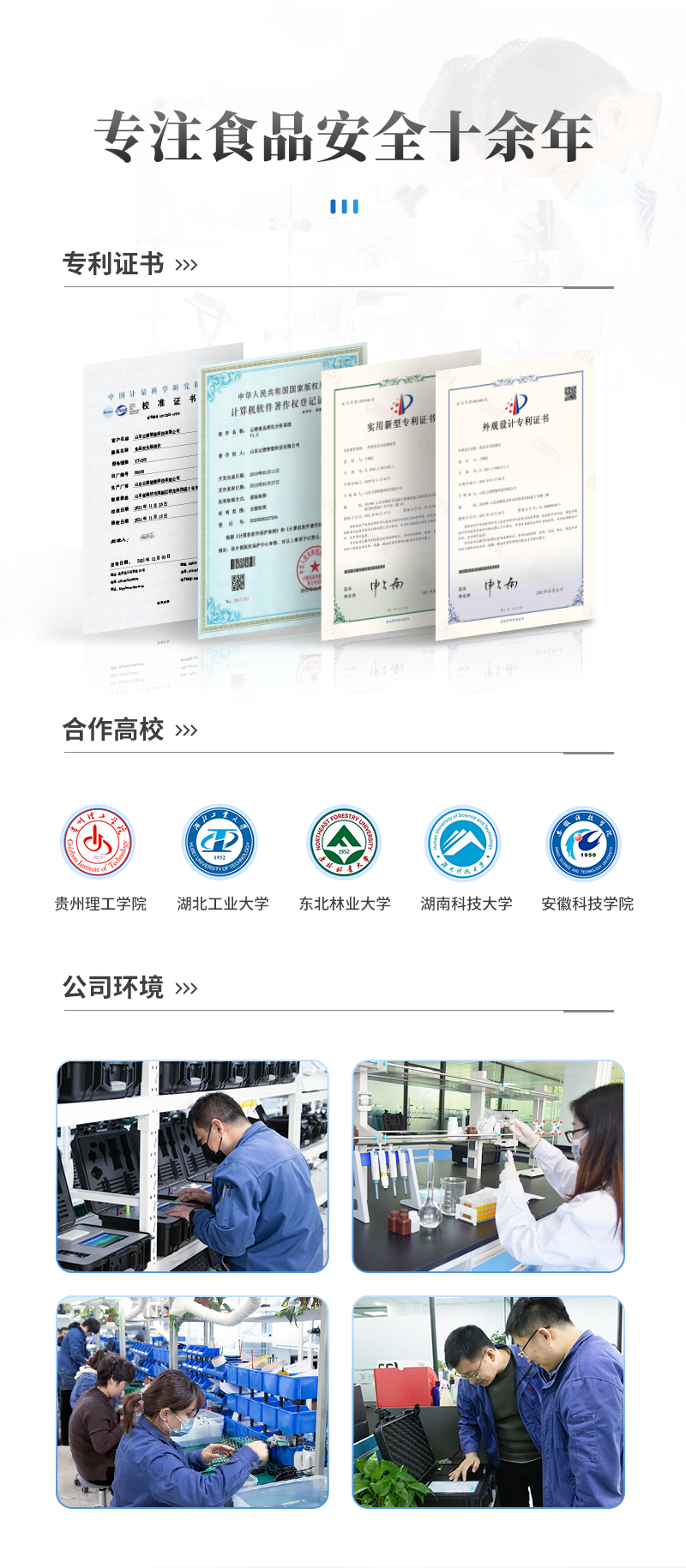 | 儀器采用臺式一體化系統(tǒng)檢測技術(shù),將分光光度模塊、新型農(nóng)殘檢測模塊、數(shù)字化管理模塊、無線通訊模塊高度集成于一體,支持檢測200種食品安全檢測項目,同時預(yù)留升級檢測方法。 | 儀器檢測模塊標(biāo)準(zhǔn)化、智能化,可隨意自由組合。檢測箱體內(nèi)置多個標(biāo)準(zhǔn)檢測單元,檢測模塊可以調(diào)整配置。 | 儀器采用全新安卓智能系統(tǒng),主控芯片采用 ARM Cortex-A7,RK3288/4核處理器,10.1寸高清液晶觸摸豎屏,更加**的UI交互界面,運轉(zhuǎn)快捷;儀器配備無線通信模塊: 4G(APN)通訊模塊、Wifi模塊,藍牙傳輸,同時具有雙USB接口以及RJ45接口能以多種方式實現(xiàn)數(shù)據(jù)保存和數(shù)據(jù)傳輸功能。 | 創(chuàng)新檢測模式: | ★檢測通道:≥12通道;采用精密旋轉(zhuǎn)比色池設(shè)計,使用同芯片同光源校準(zhǔn)精度,解決不同光源之間的誤差值。1-12通道間誤差0.1%。(**號:ZL202022821055.2) | ★儀器具有自動識別比色皿檢測功能,即:將樣品比色皿放入儀器后,點擊樣品檢測,儀器自動識別比色皿進行通道檢測。 | 進口高精光源: | 高精度進口四波長冷光源,通道配置 410、520、590、630nm 波長光源,一個光源芯片驅(qū)動一個光源,誤差極小,每臺設(shè)備單獨**校準(zhǔn)光源,**比對,同時參照四種不同波段光源全方位覆蓋市面上99%的農(nóng)殘食品項目檢測。 | 智能化操作系統(tǒng): | 便捷操作系統(tǒng):設(shè)備檢測時可在同一檢測界面自動對應(yīng)相關(guān)檢測通道一次性選擇1-12個樣品名稱,無須退出界面,節(jié)省操作時間。 | 數(shù)據(jù)集成系統(tǒng):設(shè)備首頁自動統(tǒng)計檢測數(shù)據(jù)包含:周檢測數(shù)據(jù)、月檢測數(shù)據(jù),全部檢測總數(shù)量,均包含檢測總數(shù),合格數(shù),不合格數(shù),以及相關(guān)柱形分析圖,對各項檢測數(shù)據(jù)清晰掌握,無需電腦查詢,更加快捷直觀。 | 項目預(yù)設(shè)系統(tǒng):支持添加單個及多個相同或不相同的任務(wù)預(yù)設(shè),一鍵快速調(diào)取,每一個任務(wù)分別可以設(shè)置不同的樣品、批次、編號、來源、備注、抽樣信息、檢測信息、受檢信息、復(fù)核信息等更多信息。無縫鏈接平臺和APP實時查看下發(fā)任務(wù)。 | 數(shù)據(jù)監(jiān)管系統(tǒng):同步對接監(jiān)管平臺,數(shù)據(jù)可局域網(wǎng)和互聯(lián)網(wǎng)數(shù)據(jù)上傳,檢測結(jié)果可選擇直接傳至食品安全監(jiān)管平臺。集成OSS輸出存儲服務(wù)、區(qū)分設(shè)備定向管理應(yīng)用,進行區(qū)域食品安全監(jiān)管及大數(shù)據(jù)分析處理與數(shù)據(jù)統(tǒng)計,檢測區(qū)域食品安全長短期動態(tài),達到食品安全問題預(yù)估、預(yù)警。 | 自定義打印系統(tǒng):內(nèi)置全新打印系統(tǒng),新創(chuàng)自定義打印方式,可按需靈活設(shè)置開啟或關(guān)閉:產(chǎn)品合格證(國家農(nóng)業(yè)部標(biāo)準(zhǔn)要求),二維碼,抽樣信息、檢測信息,受檢信息、復(fù)核信息、抽樣日期、檢測日期等信息的打印。 | 系統(tǒng)遠程更新功能:可定向分客戶分儀器更新系統(tǒng),按照不同客戶后期實際需求添加項目,無需機器返廠,即可遠程實時升級全新系統(tǒng),節(jié)省時間成本及避免運輸造成設(shè)備損壞。 | 儀器主機采用一體化防水、抗壓、防撞擊、防腐蝕箱體設(shè)計,同時配備交直流供電,可連接車載電源,可選配大容量充電鋰電池,滿足現(xiàn)場野外檢測需求。 | 安全證書,放心保障:儀器具有中國計量科學(xué)研究院校準(zhǔn)證書,**認證。 |