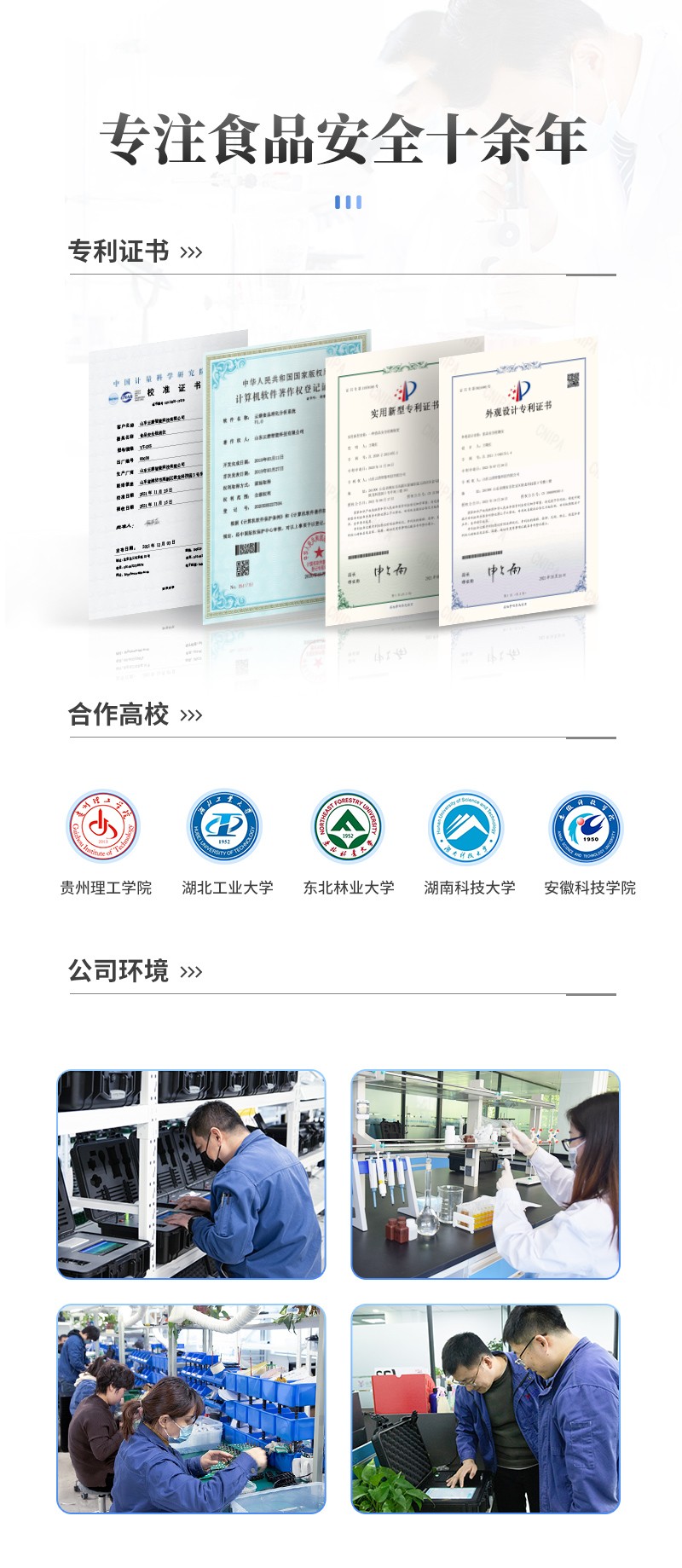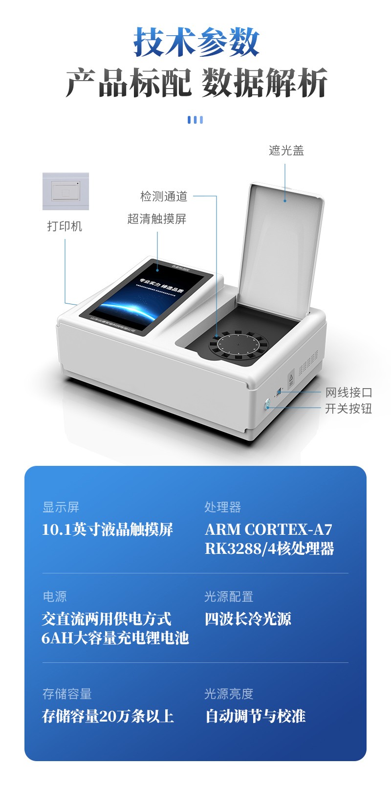 | 儀器采用臺(tái)式一體化系統(tǒng)檢測技術(shù),將分光光度模塊、新型農(nóng)殘檢測模塊、數(shù)字化管理模塊、無線通訊模塊高度集成于一體,支持檢測200種食品安全檢測項(xiàng)目,同時(shí)預(yù)留升級(jí)檢測方法。 | 儀器檢測模塊標(biāo)準(zhǔn)化、智能化,可隨意自由組合。檢測箱體內(nèi)置多個(gè)標(biāo)準(zhǔn)檢測單元,檢測模塊可以調(diào)整配置。 | 儀器采用全新安卓智能系統(tǒng),主控芯片采用 ARM Cortex-A7,RK3288/4核處理器,10.1寸高清液晶觸摸豎屏,更加**的UI交互界面,運(yùn)轉(zhuǎn)快捷;儀器配備無線通信模塊: 4G(APN)通訊模塊、Wifi模塊,藍(lán)牙傳輸,同時(shí)具有雙USB接口以及RJ45接口能以多種方式實(shí)現(xiàn)數(shù)據(jù)保存和數(shù)據(jù)傳輸功能。 | 創(chuàng)新檢測模式: | ★檢測通道:≥12通道;采用精密旋轉(zhuǎn)比色池設(shè)計(jì),使用同芯片同光源校準(zhǔn)精度,解決不同光源之間的誤差值。1-12通道間誤差0.1%。(**號(hào):ZL202022821055.2) | ★儀器具有自動(dòng)識(shí)別比色皿檢測功能,即:將樣品比色皿放入儀器后,點(diǎn)擊樣品檢測,儀器自動(dòng)識(shí)別比色皿進(jìn)行通道檢測。 | 進(jìn)口高精光源: | 高精度進(jìn)口四波長冷光源,通道配置 410、520、590、630nm 波長光源,一個(gè)光源芯片驅(qū)動(dòng)一個(gè)光源,誤差極小,每臺(tái)設(shè)備單獨(dú)**校準(zhǔn)光源,**比對(duì),同時(shí)參照四種不同波段光源全方位覆蓋市面上99%的農(nóng)殘食品項(xiàng)目檢測。 | 智能化操作系統(tǒng): | 便捷操作系統(tǒng):設(shè)備檢測時(shí)可在同一檢測界面自動(dòng)對(duì)應(yīng)相關(guān)檢測通道一次性選擇1-12個(gè)樣品名稱,無須退出界面,節(jié)省操作時(shí)間。 | 數(shù)據(jù)集成系統(tǒng):設(shè)備首頁自動(dòng)統(tǒng)計(jì)檢測數(shù)據(jù)包含:周檢測數(shù)據(jù)、月檢測數(shù)據(jù),全部檢測總數(shù)量,均包含檢測總數(shù),合格數(shù),不合格數(shù),以及相關(guān)柱形分析圖,對(duì)各項(xiàng)檢測數(shù)據(jù)清晰掌握,無需電腦查詢,更加快捷直觀。 | 項(xiàng)目預(yù)設(shè)系統(tǒng):支持添加單個(gè)及多個(gè)相同或不相同的任務(wù)預(yù)設(shè),一鍵快速調(diào)取,每一個(gè)任務(wù)分別可以設(shè)置不同的樣品、批次、編號(hào)、來源、備注、抽樣信息、檢測信息、受檢信息、復(fù)核信息等更多信息。無縫鏈接平臺(tái)和APP實(shí)時(shí)查看下發(fā)任務(wù)。 | 數(shù)據(jù)監(jiān)管系統(tǒng):同步對(duì)接監(jiān)管平臺(tái),數(shù)據(jù)可局域網(wǎng)和互聯(lián)網(wǎng)數(shù)據(jù)上傳,檢測結(jié)果可選擇直接傳至食品安全監(jiān)管平臺(tái)。集成OSS輸出存儲(chǔ)服務(wù)、區(qū)分設(shè)備定向管理應(yīng)用,進(jìn)行區(qū)域食品安全監(jiān)管及大數(shù)據(jù)分析處理與數(shù)據(jù)統(tǒng)計(jì),檢測區(qū)域食品安全長短期動(dòng)態(tài),達(dá)到食品安全問題預(yù)估、預(yù)警。 | 自定義打印系統(tǒng):內(nèi)置全新打印系統(tǒng),新創(chuàng)自定義打印方式,可按需靈活設(shè)置開啟或關(guān)閉:產(chǎn)品合格證(國家農(nóng)業(yè)部標(biāo)準(zhǔn)要求),二維碼,抽樣信息、檢測信息,受檢信息、復(fù)核信息、抽樣日期、檢測日期等信息的打印。 | 系統(tǒng)遠(yuǎn)程更新功能:可定向分客戶分儀器更新系統(tǒng),按照不同客戶后期實(shí)際需求添加項(xiàng)目,無需機(jī)器返廠,即可遠(yuǎn)程實(shí)時(shí)升級(jí)全新系統(tǒng),節(jié)省時(shí)間成本及避免運(yùn)輸造成設(shè)備損壞。 | 儀器主機(jī)采用一體化防水、抗壓、防撞擊、防腐蝕箱體設(shè)計(jì),同時(shí)配備交直流供電,可連接車載電源,可選配大容量充電鋰電池,滿足現(xiàn)場野外檢測需求。 | 安全證書,放心保障:儀器具有中國計(jì)量科學(xué)研究院校準(zhǔn)證書,**認(rèn)證。 |