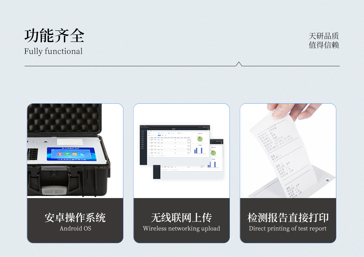 | 機箱采用工業(yè)級ABS工程塑料箱,方便攜帶,穩(wěn)固耐用,便于流動測試。 | 智能操作系統(tǒng),采用更加人性化操作,主控采用多核處理器,主頻1.88Ghz,運轉速度更快速,穩(wěn)定性更強。 | 自動判斷樣品是否合格,檢測結果更加直觀。 | 儀器具有100多種蔬菜名稱菜單庫,分類管理,并可按需添加或刪除蔬菜名,編輯蔬菜名稱,可直接打印出蔬菜名稱。 | 檢測通道:12個檢測通道,可以同時測試多個樣品,循環(huán)檢測,即放即檢,每個樣品由程序控制分別獨立工作,不會互相干擾。 | 儀器具有wifi聯網功能,可將數據快速上傳電腦,進行數據管理與統(tǒng)計,4G信號GPRS遠傳功能,可插手機卡實現數據遠傳平臺,。 | 顯示方式:7英寸高靈敏真彩觸摸屏顯示,人性化中文操作界面,讀數直觀、簡單。 | 打印機采用串口5v打印,可選擇手動打印或者自動打印,三分鐘出打印結果,打印格式為檢測人姓名、吸光度差值、檢測時間、檢測機構、樣品名稱及結果判定。 | 光源采用進口超高亮發(fā)光二極管,具有低功耗、高精度、穩(wěn)定性強、光源可控可以關掉不使用的光源,響應速度快等優(yōu)點。 | 智能恒流穩(wěn)壓,光強自動校準,長時間連續(xù)工作光源無溫漂現象。 | 采用USB2.0接口設計,方便數據的存貯和移動,并可隨時與計算機直接相連,并且可用計算機控制儀器。實現數據查詢、瀏覽、分析、統(tǒng)計、打印等。 | 智能化程度高,儀器具有自檢功能:具有開機自檢和調零功能,具有自動檢測重復性功能 | 儀器具有自身保護功能,可設置用戶名及密碼,防止非工作人員操作等。 | 采用DC12v直流供電,安全系統(tǒng)更高,并且配備6A鋰電池充電器。 | 儀器具有重新校準、鎖定、恢復出廠設置功能。 |