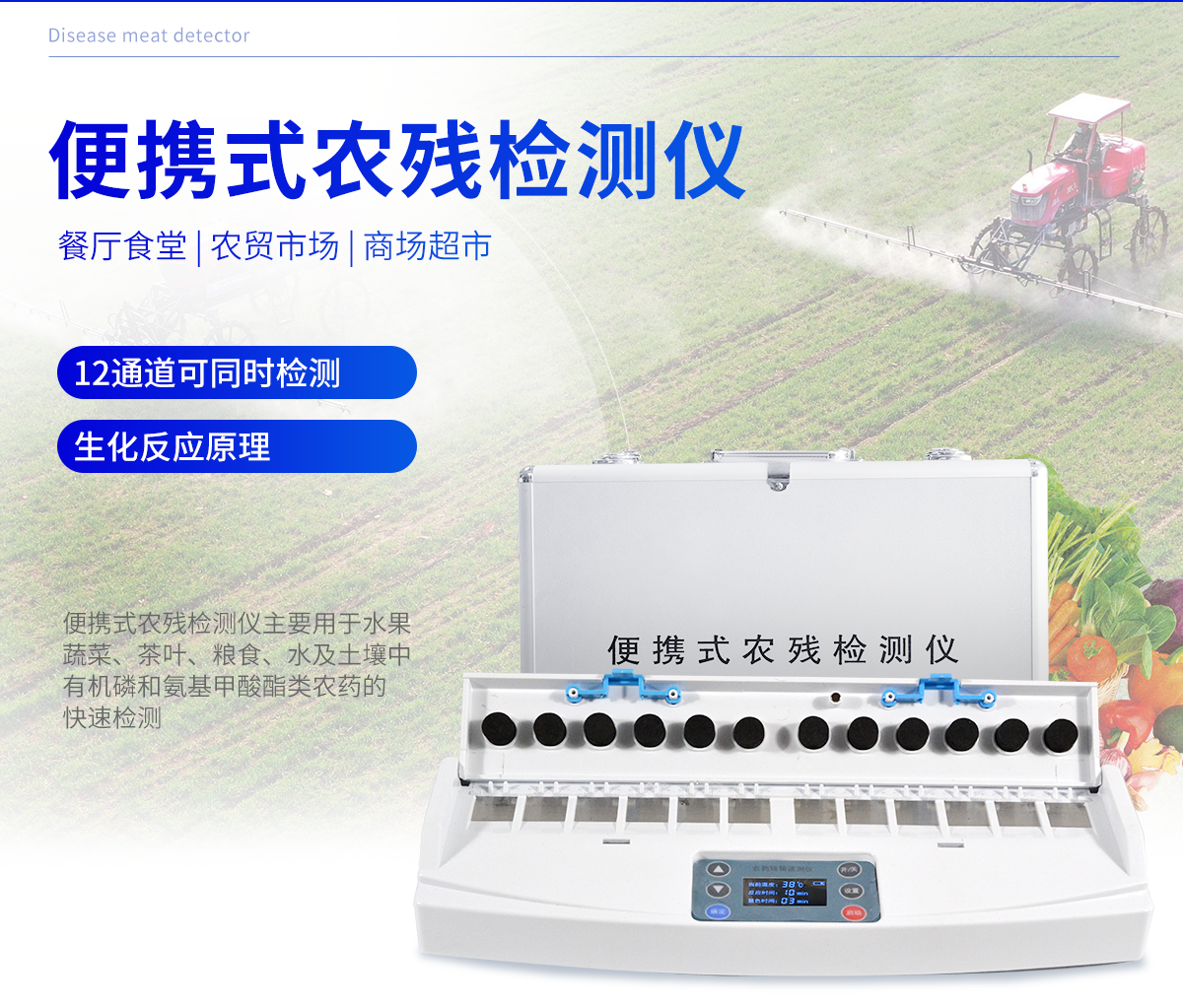 主要用于水果、蔬菜、茶葉、糧食、水及土壤中有機(jī)磷和氨基甲酸酯類農(nóng)藥的快速檢測,特別適用于各級食品安全檢測機(jī)構(gòu)現(xiàn)場執(zhí)法使用,此外還可用于果蔬茶生產(chǎn)基地和農(nóng)貿(mào)批發(fā)銷售市場現(xiàn)場檢測,餐館、食堂、家庭果蔬加工前的安全速測等