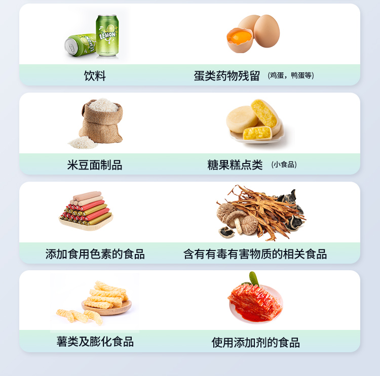 | 食品添加劑:二氧化硫、雙氧水、亞硝酸鹽、硝酸鹽、苯甲酸鈉、山梨酸鉀、糖精鈉、甜蜜素、木耳硫酸鎂等 | 有毒有害物質(zhì):甲醛、吊白塊、硼砂、過氧化苯甲酰、溴酸鉀、羅丹明B、三聚氰胺、蘇丹紅、工業(yè)堿、尿素、明礬等 | 果蔬:農(nóng)藥殘留(酶抑制率法) | 病害肉:組胺、揮發(fā)性鹽基氮 | 重金屬含量:鉛、鎘、鉻、汞、砷、錫、鎳、鋁等 | 水產(chǎn)品安全類:孔雀石綠、氯霉素、呋喃妥因、呋喃西林、呋喃它酮、呋喃唑酮等 | 瘦肉精激素類(獸藥):鹽酸克倫特羅、沙丁胺醇、萊克多巴胺、己烯雌酚等 | 抗生素殘留:四環(huán)素類、硝基呋喃類、磺胺類、β-興奮劑類、沙星類、磺胺類、喹諾酮類,甲砜霉素,氟苯尼考,金剛烷胺、替米考星、慶大霉素、林可霉素、鏈霉素、恩諾沙星、環(huán)丙沙星、頭孢啦啶、青霉素、阿莫西林等 | 真菌毒素類:食用油、糧食及飼料中黃曲霉毒素B1、黃曲霉毒素總量,奶中黃曲霉毒素M1、嘔吐毒素、玉米赤霉烯酮、赭曲霉毒素A、T2毒素、伏馬毒素等 | 水酒飲品分析:乳品及牛奶中蛋白質(zhì);酒中甲醇、乙醇、雜醇油;蜂蜜中果糖和葡萄糖、蔗糖、淀粉酶、酸度;水中氰化物、余氯,飲料中維C等 | 調(diào)味品成分: 食醋的總酸、醬油的總酸、芝麻油純度、谷氨酸鈉、醬油氨基酸態(tài)氮、食鹽中亞鐵氰化鉀、食鹽中碘等 | 食用色素類:紅色色素(胭脂紅、莧菜紅、莧菜紅)、黃色色素(檸檬黃、日落黃)、藍色色素(亮藍)等 | 動物疫病類:禽流感、新城疫、牛羊口蹄疫、牛羊結(jié)核病、牛羊包蟲、牛羊布病、小反芻獸、豬藍耳病毒、豬瘟病毒、豬偽狂犬病毒、豬細小、豬圓環(huán)、犬細小病毒、犬瘟熱病毒、犬狂犬病毒等 | 蜂蜜成分:果糖和葡萄糖、蔗糖、淀粉酶、酸度等 | 水產(chǎn)品安全類:孔雀石綠、氯霉素、呋喃妥因、呋喃西林、呋喃它酮、呋喃唑酮等 | 食用油脂:過氧化值、酸價等 | 蛋類藥物殘留:氯霉素,四環(huán)素,磺胺類,喹諾酮類,呋喃西林,呋喃它酮,呋喃妥因,呋喃唑酮,氟苯尼考,阿莫西林、頭孢氨芐、紅霉素、鏈霉素等 |