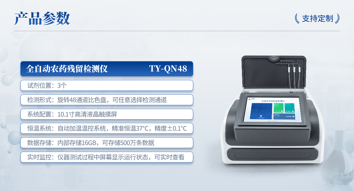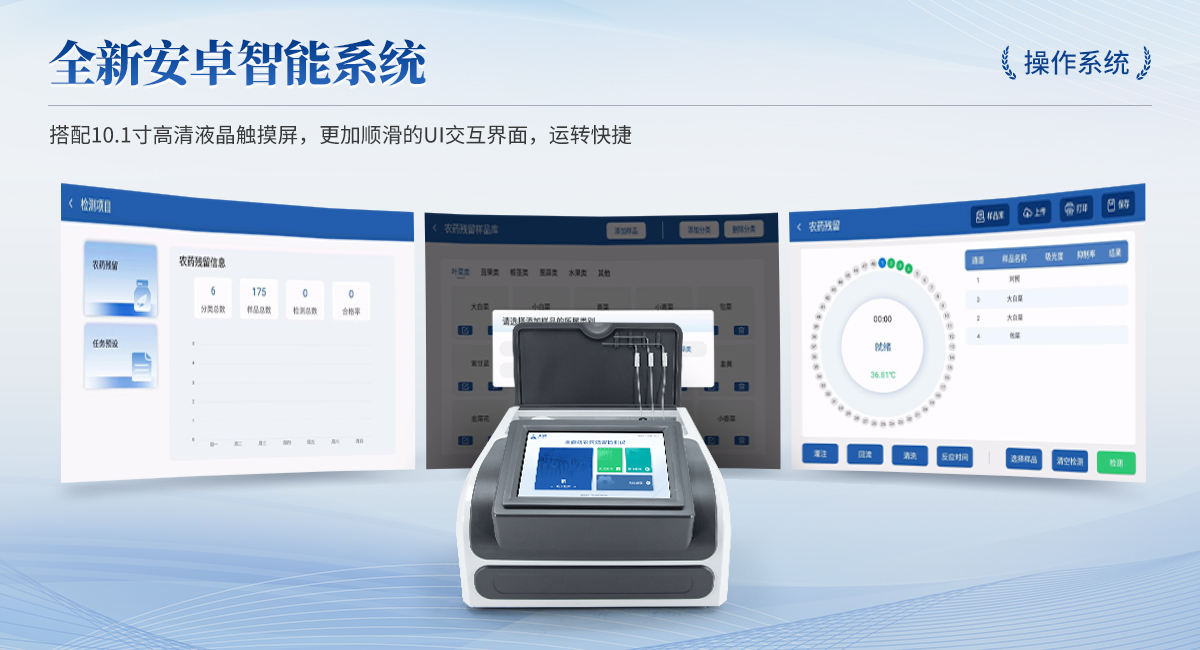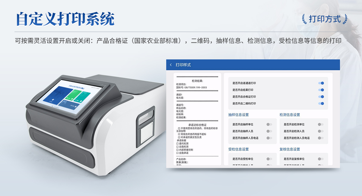 | 1. 試劑位置:3個 | 2. 檢測形式:旋轉(zhuǎn)48通道比色盤,可任意選擇檢測通道,自動對應選擇通道。 | 3. 系統(tǒng)配置:10.1寸高清液晶觸摸屏,采用ARM Cortex-A7,RK3288/4核處理器,運行內(nèi)存1GB。Android7.1.1 系統(tǒng)分辨率1280×800。 | 4.恒溫系統(tǒng):具有自動加溫溫控系統(tǒng),精準恒溫37℃,精度±0.1℃。 | 5.添加系統(tǒng):儀器按照試劑要求自動、按時、按量加入試劑,并且自動對未正常放置的樣本或異常的樣本進行檢查并提示。 | 6.清洗功能:儀器具備回流及自動清洗管路功能,避免試劑污染。 | 7.混勻功能:設備具備自動混勻功能。 | 8.光源校準:設備可自動校準,確保檢測準確度。 | 9.實時監(jiān)控:儀器測試過程中屏幕顯示運行狀態(tài),可實時查看。 | 10.數(shù)據(jù)存儲:內(nèi)部存儲16GB,可存儲500萬條數(shù)據(jù)。 | 11.樣品多選功能:設備具備樣品一鍵多選功能,選擇樣品自動匹配檢測通道。 | 12.項目預設:可提前設置單個及多個相同或不相同的檢測任務,可單次或者多次調(diào)取,減少檢測時間。 | 13.自定義打印系統(tǒng):內(nèi)置自定義打印系統(tǒng),可按需靈活設置開啟或關(guān)閉:產(chǎn)品合格證(國家農(nóng)業(yè)部標準),二維碼,抽樣信息、檢測信息,受檢信息等信息的打印。 | 14.A4版本報告打印功能:設備可自動生成A4版報告,A4報告帶二維碼,可掃描二維碼生成電子版,并可識別真?zhèn)巍?/td> | 15.傳輸方式:儀器配備無線通信模塊: 4G(APN)通訊模塊、Wifi模塊,藍牙傳輸模塊,同時具有USB接口以及RJ45接口能以多種方式實現(xiàn)數(shù)據(jù)保存和數(shù)據(jù)傳輸功能,設備數(shù)據(jù)可以同步上傳至平臺。 | 16.數(shù)據(jù)監(jiān)管系統(tǒng):設備自帶監(jiān)管平臺,并可同步對接監(jiān)管平臺,數(shù)據(jù)可局域網(wǎng)和互聯(lián)網(wǎng)數(shù)據(jù)上傳,檢測結(jié)果可直接傳至食品安全監(jiān)管平臺。達到食品安全問題預估、預警。 | 17.系統(tǒng)遠程更新功能:無需設備返廠,即可遠程實時升級全新系統(tǒng),節(jié)省時間成本及避免運輸造成設備損。 |