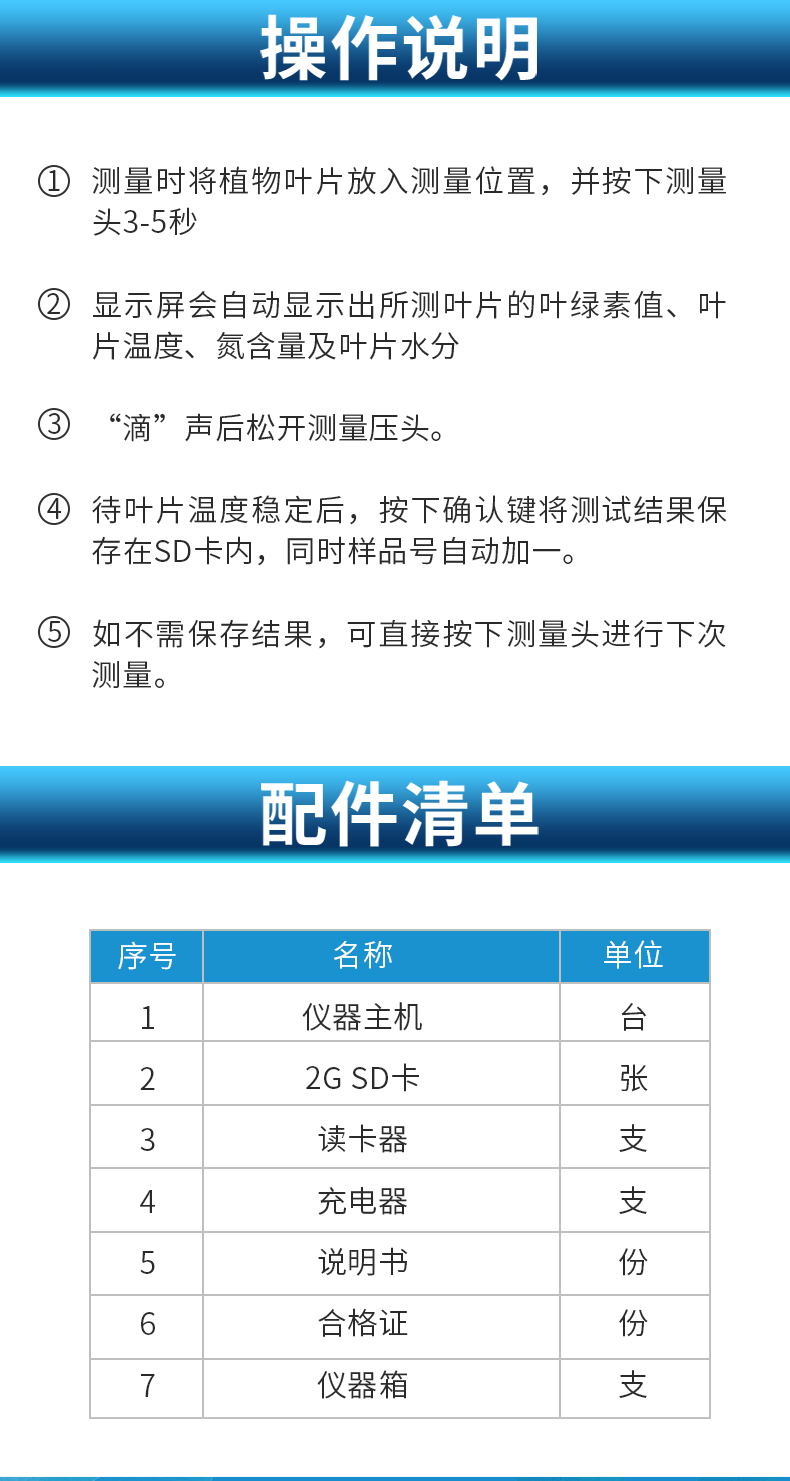 | 測(cè)量對(duì)象:陸地植物葉片 | 測(cè)量原理: 650nm和940nm兩種波長(zhǎng)下光密度差 | 測(cè)量范圍 0.0-99.9 SPAD | 測(cè)量面積 2mm*3mm | 測(cè)量精度 ±1.0 SPAD單位以?xún)?nèi) (室溫下,SPAD值介乎0-50) | 重復(fù)性 ±0.3 SPAD單位以?xún)?nèi) (SPAD值介乎0-50,保持測(cè)量位置不變) | 測(cè)量時(shí)間間隔 小于2秒 | 測(cè)量面積:2mm*2mm | 測(cè)量時(shí)間間隔:小于3秒 | 內(nèi)存 內(nèi)存16GB,可計(jì)算/顯示平均值,以及刪除異常值 | 樣品厚度** 1 mm | 樣品插入深度 10 mm | 電源 4.2V可充電鋰電池 | 電池容量 2000mah | 重量 250g | 外形尺寸 140×85×45mm(長(zhǎng)×寬×高) | 操作溫度/濕度范圍:0 - 50°C,相對(duì)濕度85% | 儲(chǔ)存溫度/濕度范圍:20 - 55°C,相對(duì)濕度85% | 標(biāo)準(zhǔn)配置:主機(jī), 充電器,USB數(shù)據(jù)線,便攜鋁箱,說(shuō)明書(shū)等 |
