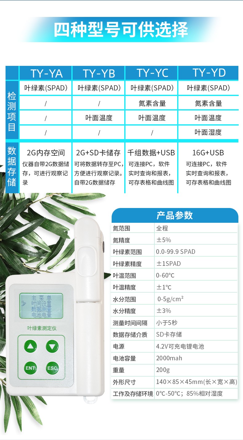 產(chǎn)品描述:儀器用途: TY-YD葉綠素測(cè)定儀根據(jù)葉綠素光譜吸收規(guī)律,采用兩種不同的發(fā)光管照射葉片,通過(guò)測(cè)量透過(guò)葉片的光的強(qiáng)度計(jì)算出葉片內(nèi)的葉綠素相對(duì)含量或者綠色程度,從而為合理、適當(dāng)、及時(shí)施肥提供可靠的科學(xué)依據(jù),廣泛應(yīng)用于農(nóng)業(yè)、林業(yè)、植物等科學(xué)研究和生產(chǎn)指導(dǎo)。 儀器特點(diǎn):【詳情】