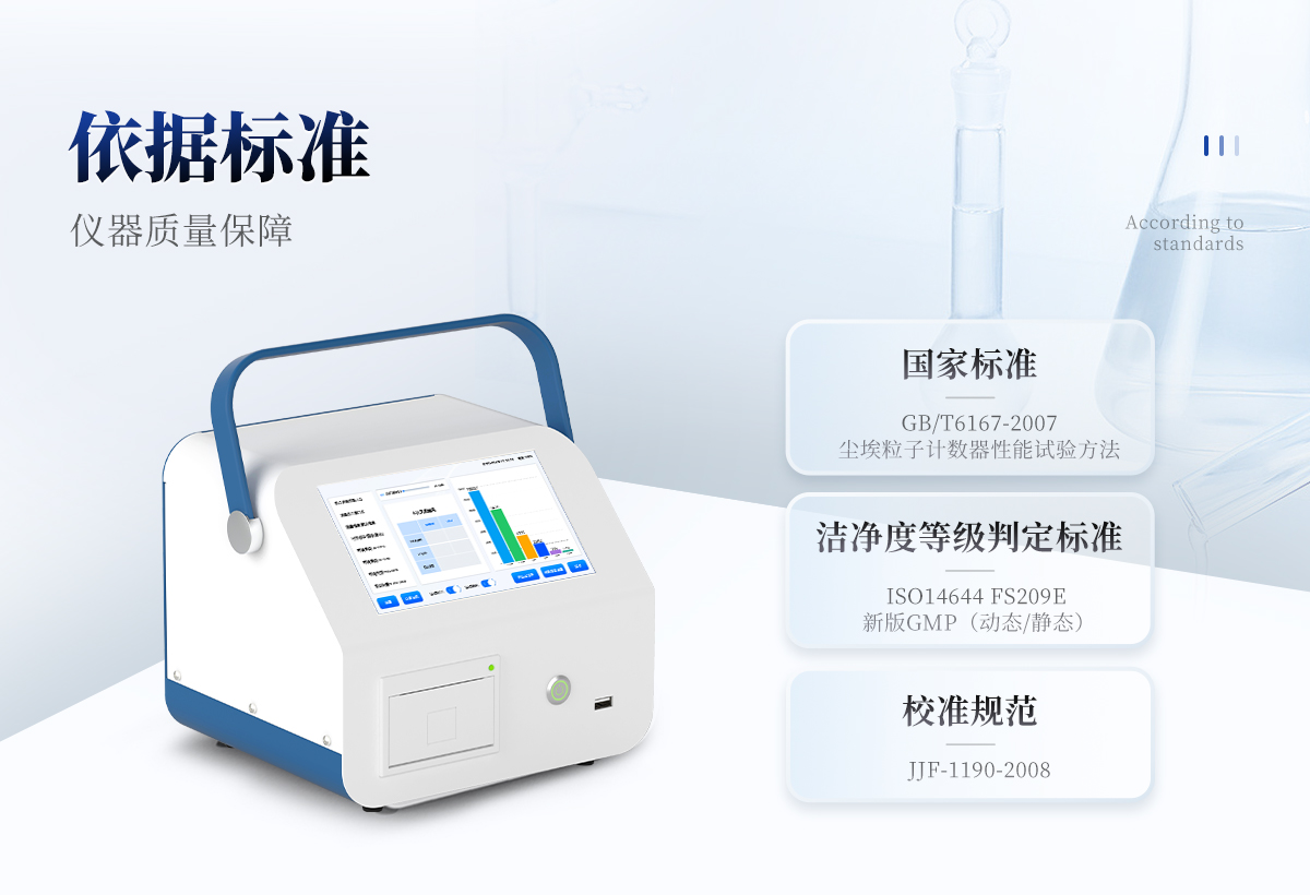國家標準:GB/T6167-2007塵埃粒子計數(shù)器性能試驗方法 潔凈度等級判定標準:ISO14644 FS209E ,新版GMP(動態(tài)/靜態(tài)) 校準規(guī)范:JJF-1190-2008
