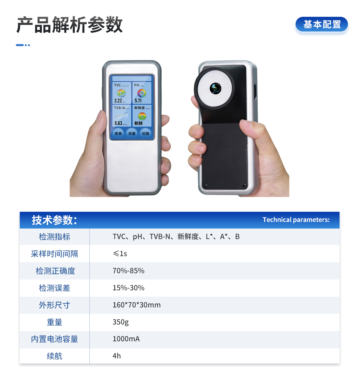 | 1. ※檢測指標:TVC、pH、TVB-N、新鮮度、L*、A*、B | 2. 采樣時間間隔:≤1s | 3. 檢測正確度:70%-85% | 4. 檢測誤差:15%-30% | 10. 外形尺寸:160*70*30mm | 11. 重量:350g | 12. 內置電池容量:1000mA | 13. 續(xù)航:4h |