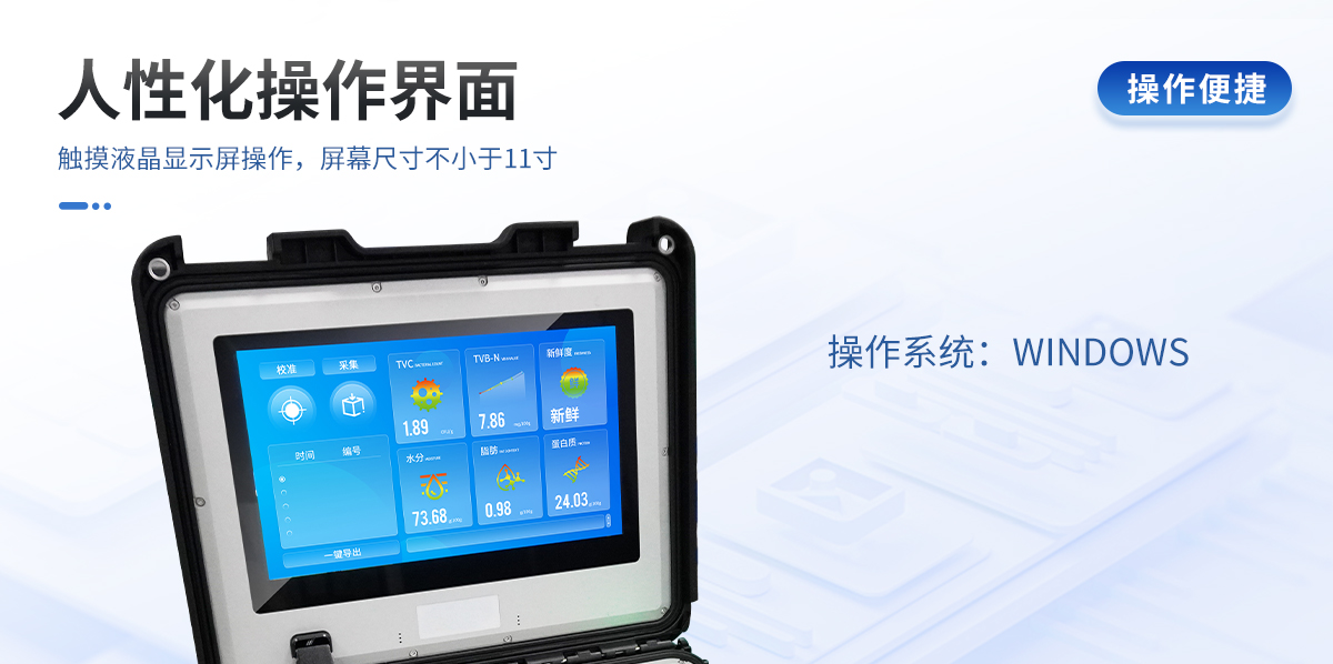 產(chǎn)品描述:產(chǎn)品介紹: 可用于檢測(cè)生鮮肉的蛋白質(zhì)、脂肪、水分、pH、TVC、TVB-N、新鮮度、L*、A*、B*等品質(zhì)參數(shù)。配備手提箱式防水減震外殼、大尺寸觸控屏幕并內(nèi)置大容量電池,可一鍵自動(dòng)校準(zhǔn),是一款適合移動(dòng)作業(yè)場(chǎng)景的高精度生鮮肉品質(zhì)檢測(cè)儀,其可用于生鮮肉及肉品生產(chǎn)、加工、儲(chǔ)運(yùn)企業(yè)、肉品品質(zhì)監(jiān)管部門等。【詳情】