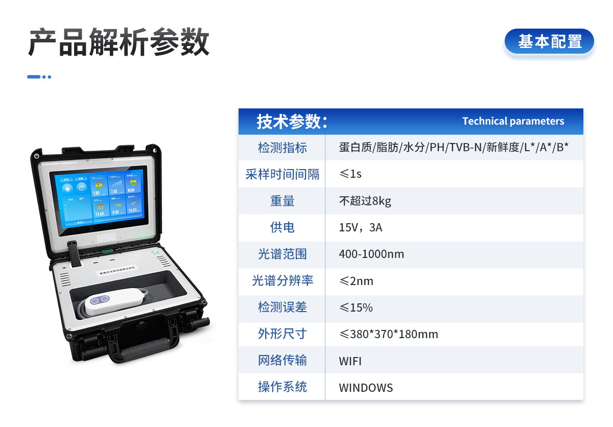| 1. ※檢測(cè)指標(biāo):蛋白質(zhì)、脂肪、水分、PH、TVB-N、新鮮度、L*、A*、B* | 2. 采樣時(shí)間間隔:≤1s | 3. 重量:不超過8kg | 4. 供電:15V,3A | 5. 觸摸液晶顯示屏操作,屏幕尺寸不小于11寸 | 6. ※光譜范圍:400-1000nm | 7. ※光譜分辨率:≤2nm | 8. 檢測(cè)誤差:≤15% | 9. ※提供模型自動(dòng)優(yōu)化平臺(tái),用戶可通過設(shè)備建立和優(yōu)化算法模型 | 10. 外形尺寸:≤380*370*180mm | 11. 網(wǎng)絡(luò)傳輸:WIFI | 12. 操作系統(tǒng):WINDOWS | 13. 采用便攜式手提箱設(shè)計(jì),外殼為ABS防沖擊材料,適合在現(xiàn)場(chǎng)快速檢測(cè) |