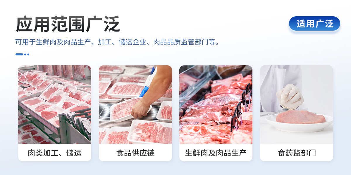 可用于檢測(cè)生鮮肉的蛋白質(zhì)、脂肪、水分、pH、TVC、TVB-N、新鮮度、L*、A*、B*等品質(zhì)參數(shù)。配備手提箱式防水減震外殼、大尺寸觸控屏幕并內(nèi)置大容量電池,可一鍵自動(dòng)校準(zhǔn),是一款適合移動(dòng)作業(yè)場(chǎng)景的高精度生鮮肉品質(zhì)檢測(cè)儀,其可用于生鮮肉及肉品生產(chǎn)、加工、儲(chǔ)運(yùn)企業(yè)、肉品品質(zhì)監(jiān)管部門等。