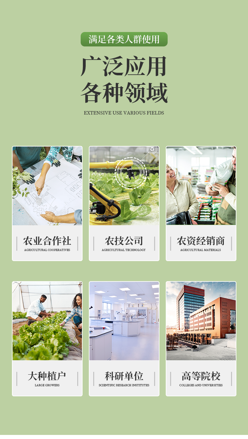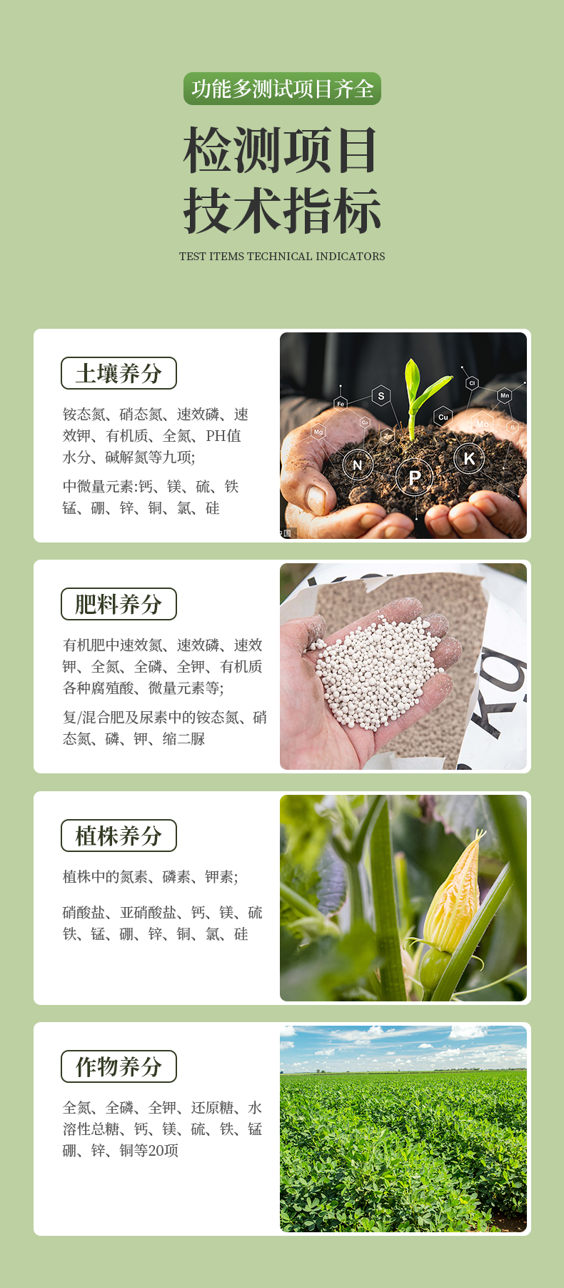 | 土壤養(yǎng)分:● 銨態(tài)氮、速效磷、速效鉀、水份、有機(jī)質(zhì)、酸堿度(pH試紙法)等項; | 肥料養(yǎng)分:● 單質(zhì)化肥中的氮、磷、鉀; ● 復(fù)(混)合肥及尿素中的銨態(tài)氮、磷、鉀; ● 有機(jī)肥中速效氮、速效磷、速效鉀、全氮、全磷、全鉀、pH、有機(jī)質(zhì)等。 |