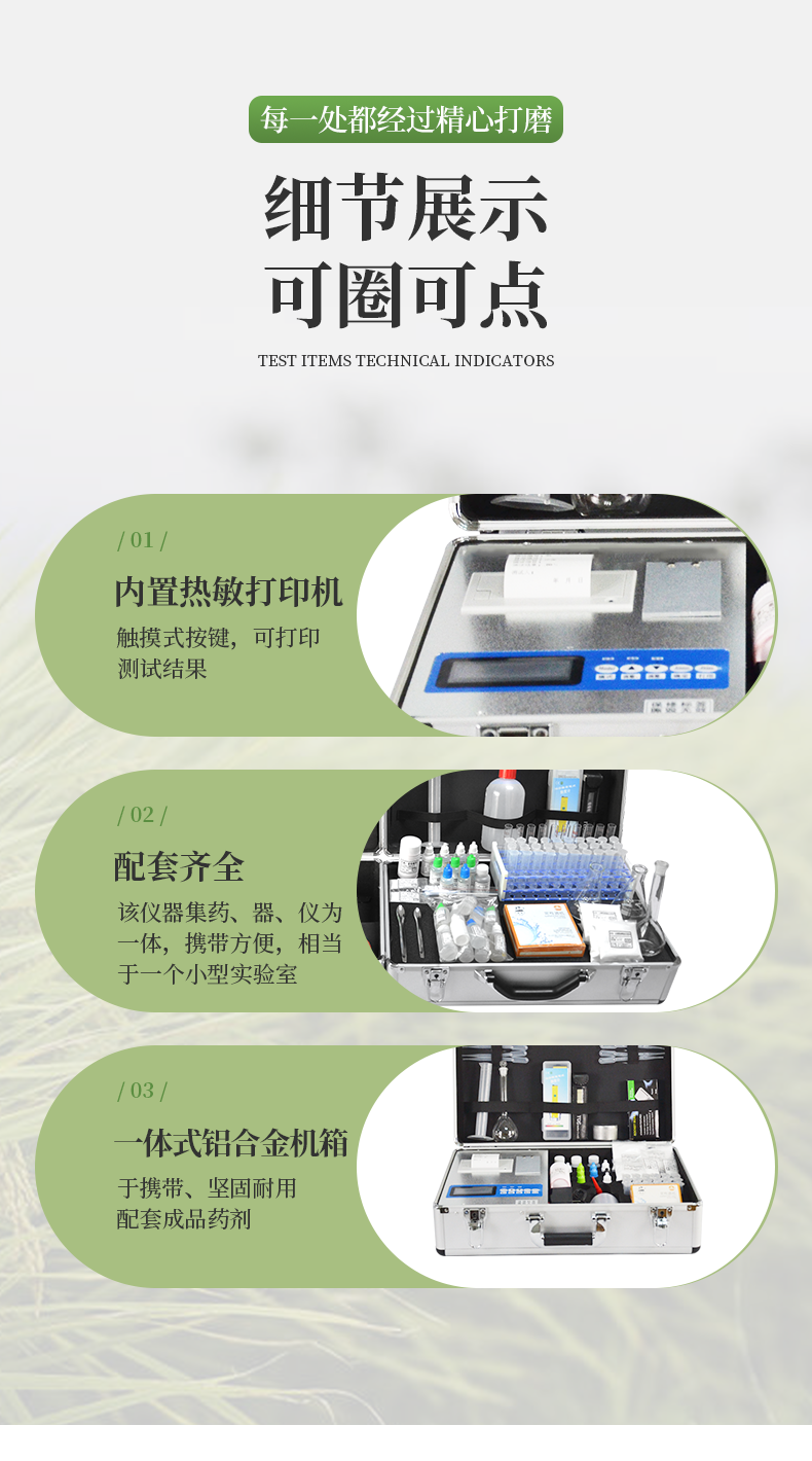| 《機(jī)箱/藥劑一體式鋁合金機(jī)箱》設(shè)計,便于攜帶、堅固耐用,配套成品藥劑。 | 微電腦控制,數(shù)字化線路、程序化設(shè)計,液晶顯示,交直流兩用,可野外流動測試,大程度降低操作者的失誤和勞動強(qiáng)度。 | 分辨率:0.001,觸摸式按鍵,內(nèi)置熱敏打印機(jī),可打印測試結(jié)果。 | 可檢測土壤及化肥、有機(jī)肥、植株中的速效氮、有效磷、速效鉀、全氮、全磷、全鉀、有機(jī)質(zhì)含量,土壤酸堿度,含鹽量(擴(kuò)展)。 | 土壤養(yǎng)分速測儀采用高亮度 LED 燈作為光源, 硅半導(dǎo)體作為信號接收系統(tǒng), 壽命長達(dá)10萬小時級別。光源穩(wěn)定,一致性好。 | 比色槽部分采用單通道、雙光路設(shè)計,無機(jī)械位移及磨損,光路測試定位**,保證測定結(jié)果精度。 |