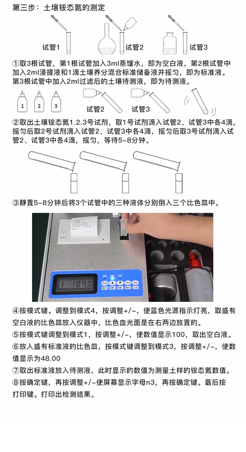 | 配套齊全:土壤養(yǎng)分速測儀該儀器集藥、器、儀為一體,攜帶方便,相當(dāng)于一個小型實驗室。適于農(nóng)業(yè)服務(wù)部門或農(nóng)資經(jīng)銷商、肥料廠商測土施肥和鑒別肥料真假。 | 操作簡便、速度快捷,成品藥劑開瓶即用,無須配置。 | 性能可靠:工作穩(wěn)定性優(yōu)于國家標(biāo)準(zhǔn)JJG179-90指標(biāo)的6倍,重復(fù)性達(dá)到光柵型分光光度計指標(biāo)水平。 |