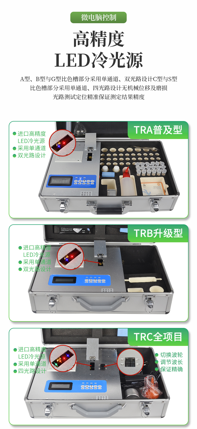 | 《機(jī)箱/藥劑一體式鋁合金機(jī)箱》設(shè)計(jì),便于攜帶、堅(jiān)固耐用,配套成品藥劑。 | 微電腦控制,數(shù)字化線路、程序化設(shè)計(jì),液晶顯示,交直流兩用,可野外流動(dòng)測(cè)試,大程度降低操作者的失誤和勞動(dòng)強(qiáng)度。 | 分辨率:0.001,觸摸式按鍵,內(nèi)置熱敏打印機(jī),可打印測(cè)試結(jié)果。 | 全項(xiàng)目土壤肥料養(yǎng)分速測(cè)儀可檢測(cè)土壤及化肥、有機(jī)肥(含葉面肥、水溶肥、噴施肥等)、植株中的速效氮、速效磷、有效鉀、全氮、全磷、全鉀、有機(jī)質(zhì)、酸堿度,鈣、鎂、硫、鐵、錳、硼、鋅、銅、氯、硅等各種中微量元素。 | 采用高亮LED光源,濾光式處理,保證光源波長(zhǎng)穩(wěn)定, 硅半導(dǎo)體作為信號(hào)接收系統(tǒng), 壽命長(zhǎng)達(dá)10萬(wàn)小時(shí)級(jí)別。光源穩(wěn)定,重現(xiàn)性好,準(zhǔn)確度高。 | 比色槽部分采用單通道設(shè)計(jì),無(wú)機(jī)械位移及磨損,光路測(cè)試定位**,保證測(cè)定結(jié)果精度。 | 配套專(zhuān)家施肥系統(tǒng)數(shù)據(jù),可對(duì)百余種全國(guó)農(nóng)業(yè)、果樹(shù)、 經(jīng)濟(jì)作物的目標(biāo)產(chǎn)量科學(xué)計(jì)算推薦施肥量。 |