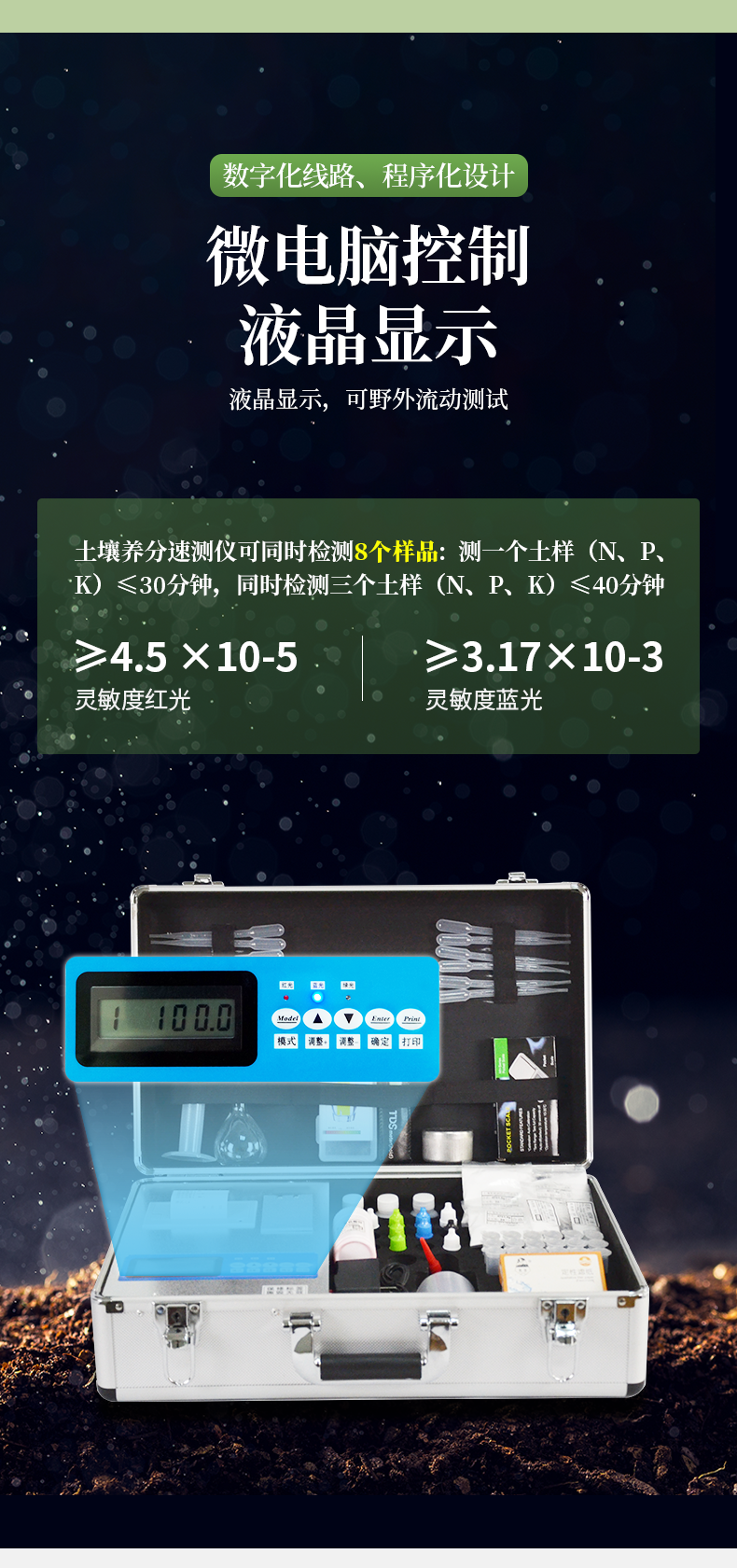 | 全國《機箱/藥劑一體式鋁合金機箱》設(shè)計,便于攜帶、堅固耐用,配套成品藥劑。 | 微電腦控制,數(shù)字化線路、程序化設(shè)計,液晶顯示,交直流兩用,測試數(shù)據(jù)可存儲查詢,可野外流動測試,**程度降低操作者的失誤和勞動強度。 | 分辨率:0.001,觸摸式按鍵,內(nèi)置新一代熱敏打印機,可打印測試結(jié)果。 | 肥料養(yǎng)分專用快速檢測儀可檢測化肥、有機肥中的速效氮、速效磷、有效鉀、全氮、全磷、全鉀、有機質(zhì)含量等。 | 采用高亮度 LED 燈作為光源, 硅半導體作為信號接收系統(tǒng), 壽命長達10萬小時級別。光源穩(wěn)定,一致性好。 | 比色槽部分采用單通道、雙光路設(shè)計,無機械位移及磨損,光路測試定位**,保證測定結(jié)果精度。 | 采用自主發(fā)明分析方法,保證檢測結(jié)果絕對達到國標要求。 | 肥料打印結(jié)果為百分含量,測試誤差小于1%。 |