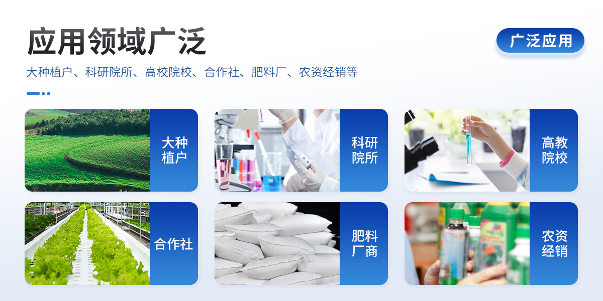 | 配套齊全:該儀器相當于一個小型實驗室,無需用戶自配附件。適于農(nóng)業(yè)服務(wù)部門或農(nóng)資經(jīng)銷商、合作社、肥料廠商、大種植戶測土施肥。 | 檢測功能全:測試項目國內(nèi)外全面,除標配試劑外,其他各類藥劑均可加配選購。 | 操作簡便、速度快捷,配套整套附件及成品藥劑開瓶即用,無須配置。 |
