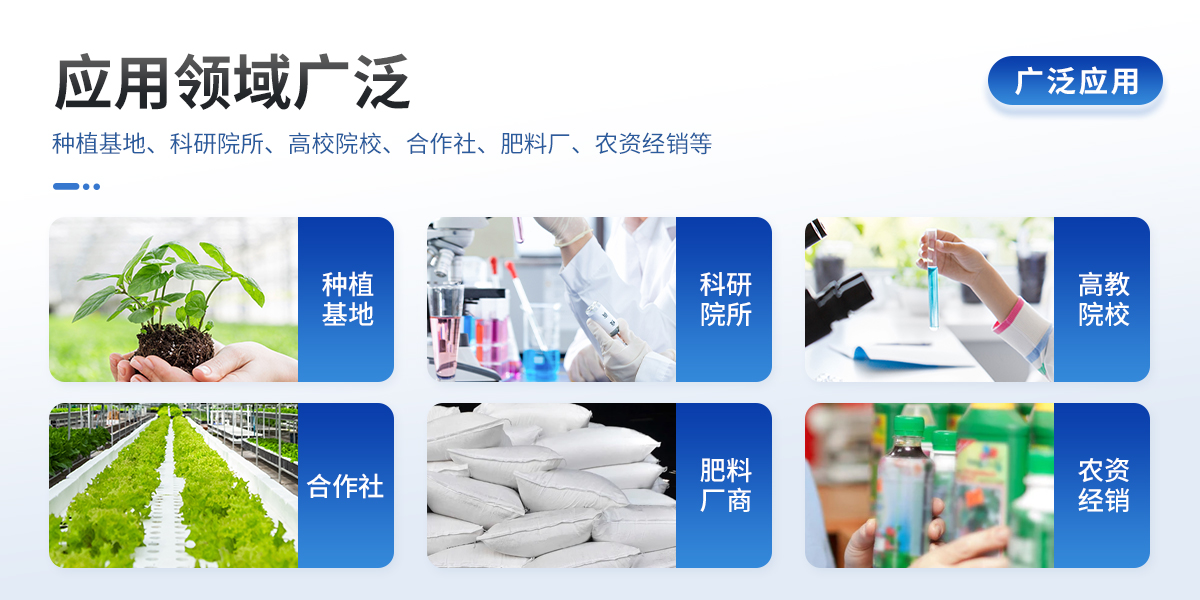 | 土壤養(yǎng)分:●土壤銨態(tài)氮、土壤有效磷、土壤速效鉀、土壤硝態(tài)氮、土壤堿解氮、土壤全氮、土壤全磷、土壤全鉀、土壤有機(jī)質(zhì)(丘林法)、土壤有機(jī)質(zhì)(浸提法)、PH值、含鹽量、水分。●土壤中微量元素:土壤鈣、土壤鎂、土壤硫、土壤硅、土壤硼、土壤鐵、土壤銅、土壤錳、土壤鋅、土壤氯;●土壤重金屬:土壤鉛、土壤砷、土壤鎘、土壤鉻、土壤汞。 | 環(huán)境:土壤濕度、土壤溫度、土壤電導(dǎo)率、空氣溫度、空氣濕度、露點(diǎn)、大氣壓力、光照度、二氧化碳; | 肥料養(yǎng)分:●單質(zhì)肥:氮肥中銨態(tài)氮、肥料硝態(tài)氮、尿素氮、縮二脲、磷肥中磷、磷肥中水溶性磷、鉀肥中鉀;●復(fù)合肥全氮、復(fù)合肥全磷、復(fù)合肥全鉀;●有機(jī)肥全氮、有機(jī)肥全磷、有機(jī)肥全鉀、有機(jī)肥硝態(tài)氮、有機(jī)肥速效磷、有機(jī)肥速效鉀、有機(jī)肥酸解氮、有機(jī)質(zhì);●水溶性腐植酸(風(fēng)化煤)、水溶性腐植酸(褐煤)、水溶性腐植酸(泥炭)、游離態(tài)腐植酸(風(fēng)化煤)、游離態(tài)腐植酸(褐煤)、游離態(tài)腐植酸(泥炭);●水溶肥全氮、水溶肥全磷、水溶肥全鉀;●葉面肥全氮、葉面肥全磷、葉面肥全鉀;●各種肥料微量元素:肥料鈣、肥料鎂、肥料硫、肥料硅、肥料硼、肥料鐵、肥料銅、肥料錳、肥料鋅、肥料氯;●肥料重金屬:肥料鉛、肥料砷、肥料鎘、肥料鉻、肥料汞。 | 鮮作物營(yíng)養(yǎng):●作物硝態(tài)氮、作物銨態(tài)氮、作物磷、作物鉀;●作物中微量元素:作物鈣、作物鎂、作物硫、作物硅、作物硼、作物鐵、作物銅、作物錳、作物鋅、作物氯;●作物中硝酸鹽、亞硝酸鹽、總糖量、還原糖、蛋白質(zhì)。 | 干植株?duì)I養(yǎng):●植株全氮、植株全磷、全鉀、植株中微量元素:植株全鈣、植株全鎂、植株全硫、植株全鐵、植株全錳、植株全硼、植株全鋅、植株全銅、植株全氯、植株全硅。 | 煙葉營(yíng)養(yǎng):●全氮、全磷、全鉀、還原糖、水溶性總糖、硼、錳、鐵、銅、鈣、鎂等20項(xiàng)。 | 食品(水果、蔬菜等):●農(nóng)藥殘留、硝酸鹽、亞硝酸鹽、鉛、砷、鎘、鉻、汞、銅、鋁、二氧化硫、雙氧水、苯甲酸鈉、山梨酸、糖精鈉、甜蜜素、硫酸鎂、甲醛、吊白塊、硼砂、溴酸鉀、總酸、色素、蛋白質(zhì)、葡萄糖、淀粉酶等項(xiàng)。 | 水質(zhì)中:COD、氨氮、總磷、總氮、余氯、溶解氧、二氧化氯、水中氰化物;重金屬鉛、砷、鎘、鉻、汞;水中硝酸鹽、亞硝酸鹽、硬度、PH、鐵、銅、錳、鋅、鋁、硼、氯、硫、硅等 |