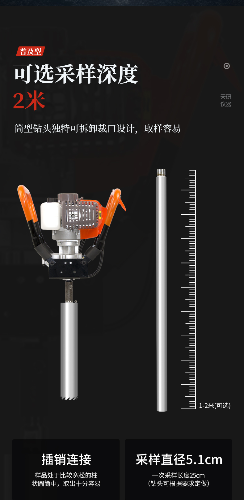 | 旋轉(zhuǎn)式,上下沒有擾動,不會破壞土壤剖面結(jié)構(gòu) | 采樣量大,插銷連接,易于拆卸。 | 鉆頭帶有鋸齒,通過沖擊錘鉆入土壤,入土容易。 | 筒型鉆頭獨特可拆卸裁口設(shè)計,取樣容易。 | 樣品處于比較寬松的柱狀圓筒中,取出十分容易 | 狀土壤很難被壓縮(保持原狀) | 采集一個樣本就可以研究整個土壤剖面情況 | 比開挖一個采樣坑要節(jié)約時間和減少樣本破壞 | 可有效地用于所有類型的土壤 |