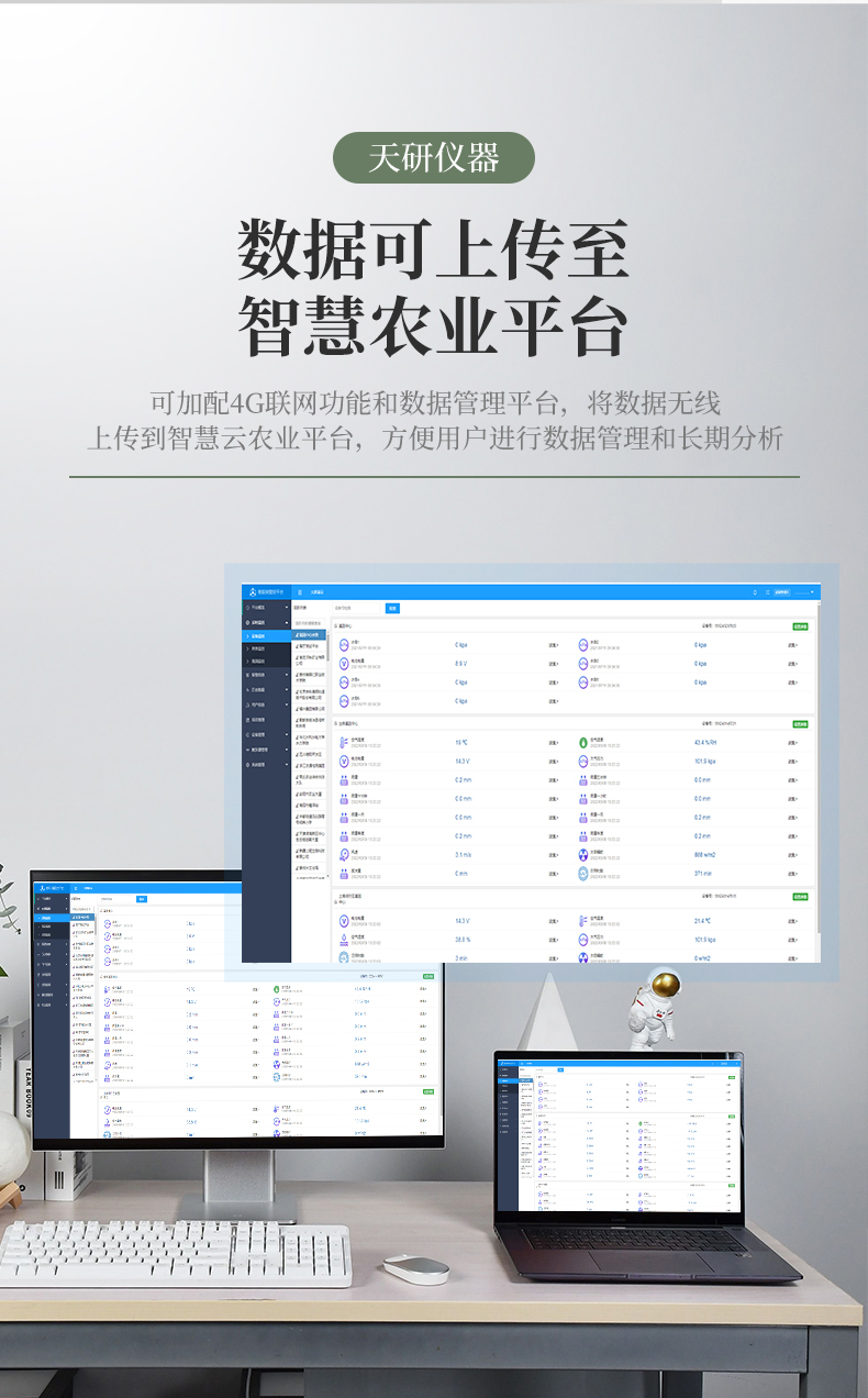 | 儀器可加配4G聯(lián)網(wǎng)功和能數(shù)據(jù)管理平臺,將本機存儲的被測點環(huán)境因子測量歷史數(shù)據(jù)無線上傳到智慧云農(nóng)業(yè)平臺,方便用戶進行數(shù)據(jù)管理和長期分析。 | 本機體積小巧、美觀,操作簡單方便,性能可靠,野外攜帶極為方便。主機連接傳感器后可以手動存儲記錄也可通過主機任意設(shè)置采樣間隔,自動存儲記錄數(shù)據(jù)。 | 大屏幕彩色液晶顯示屏,全程跟蹤記錄各個被測環(huán)境因子的數(shù)值、組數(shù)、低電壓示警,主機內(nèi)置大容量存儲器,可儲存三十萬條數(shù)據(jù),具有斷電數(shù)據(jù)自動存儲保護功能。 | 各個傳感器插入主機后,主機具有自動識別功能,傳感器一致性好,可按需求自行組合傳感器,不同參數(shù)的傳感器接口可以互相轉(zhuǎn)換,對測量精度沒有影響。 | 儀器具有多通道自動檢測擴展功能,可以實現(xiàn)多個傳感器同時接入的同步檢測。 | 上位機軟件功能強大,隨時可以通過USB接口將記錄中的數(shù)據(jù)導出到計算機上,并可以存儲為EXCE表格文件,生成數(shù)據(jù)曲線,以供其它分析軟件進一步進行數(shù)據(jù)處理。具有設(shè)置超限區(qū)域著色功能,超限數(shù)據(jù)變色預警,可作為環(huán)境評價的一個依據(jù)。 |