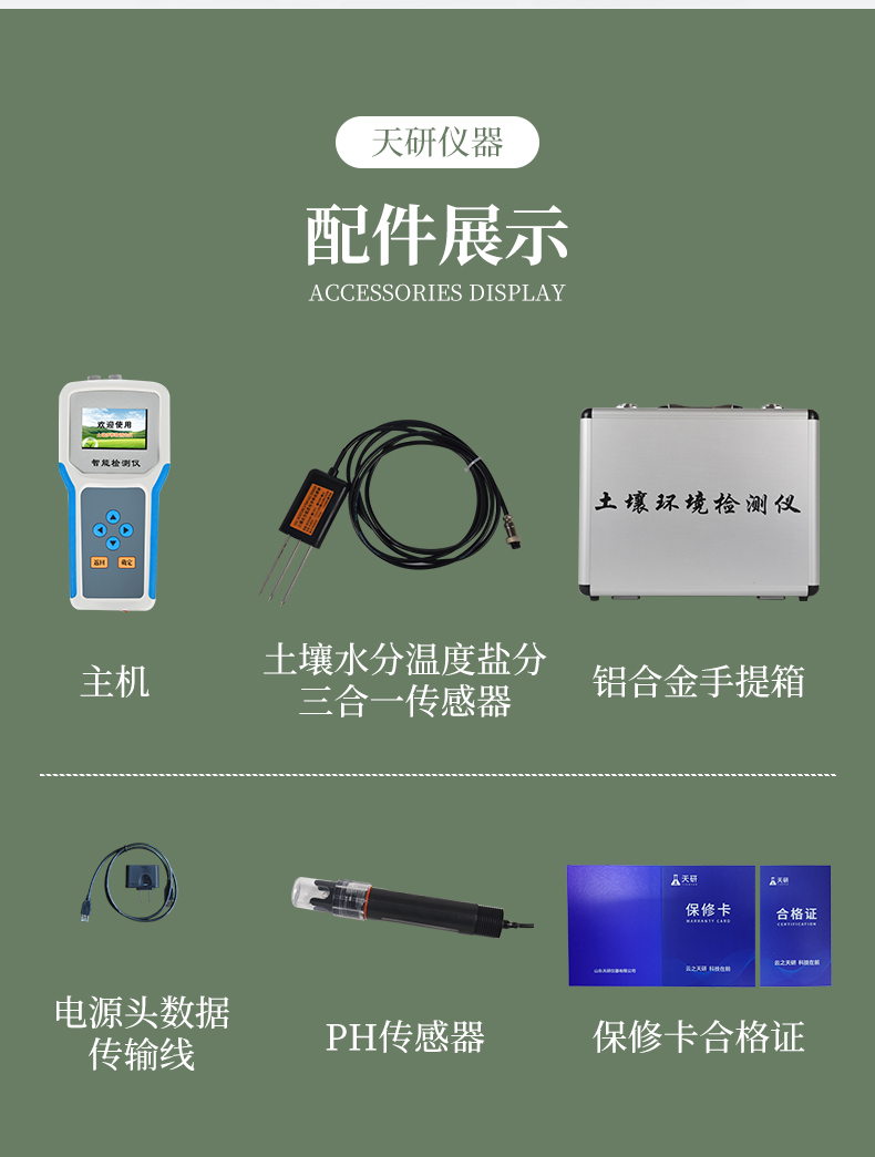 | 測量參數(shù):土壤容積含水量; 單位:%(m3/m3); 測試靈敏度:±0.01 %(m3/m3); | 量程:0-100%(m3/m3) 測量精度:0-50%(m3/m3)范圍內(nèi))±2%(m3/m3); | 50-100%(m3/m3)范圍內(nèi))±3%(m3/m3); 分辨率:0.1% | 土壤溫度范圍:-40-120℃ 測量精度:±0.2℃ 分辨率:±0.1℃ | 土壤鹽分范圍:0-20ms 測量精度:±2% 分辨率:±0.1ms | PH測量范圍:0-14 分辨率:0.1 測量精度:±0.2% | 集成電極:土壤水分,土壤溫度,土壤鹽分三合一,集成到一個傳感器; | ph復合電極:電極為復合電極,自動溫度補償,測試更穩(wěn)定更準確。 | 儀器尺寸:10×21×3.5cm | 供電方式:鋰電池供電、交流電兩種方式 | 軟件:上位機軟件免費贈送 |