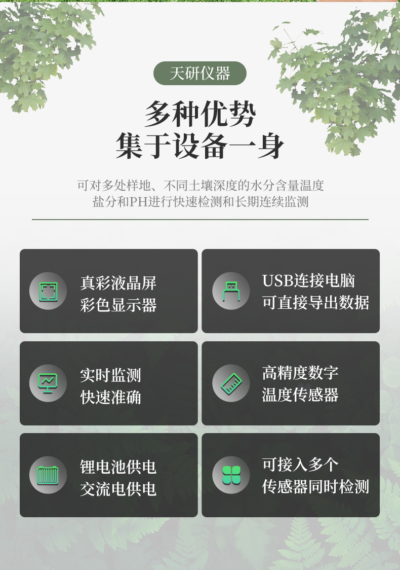 土壤水分溫度鹽分測定儀傳感器采用一體化結(jié)構(gòu)設(shè)計,可快速準確測量土壤中含水量、溫度和電導率(鹽分),可對多處樣地、不同土壤深度的水分含量溫度和鹽分進行快速檢測和長期連續(xù)監(jiān)測。廣泛應用于土壤墑情檢測、旱作節(jié)水灌溉、精細農(nóng)業(yè)、林業(yè)、地質(zhì)勘探、植物培育、水利、環(huán)保等領(lǐng)域。