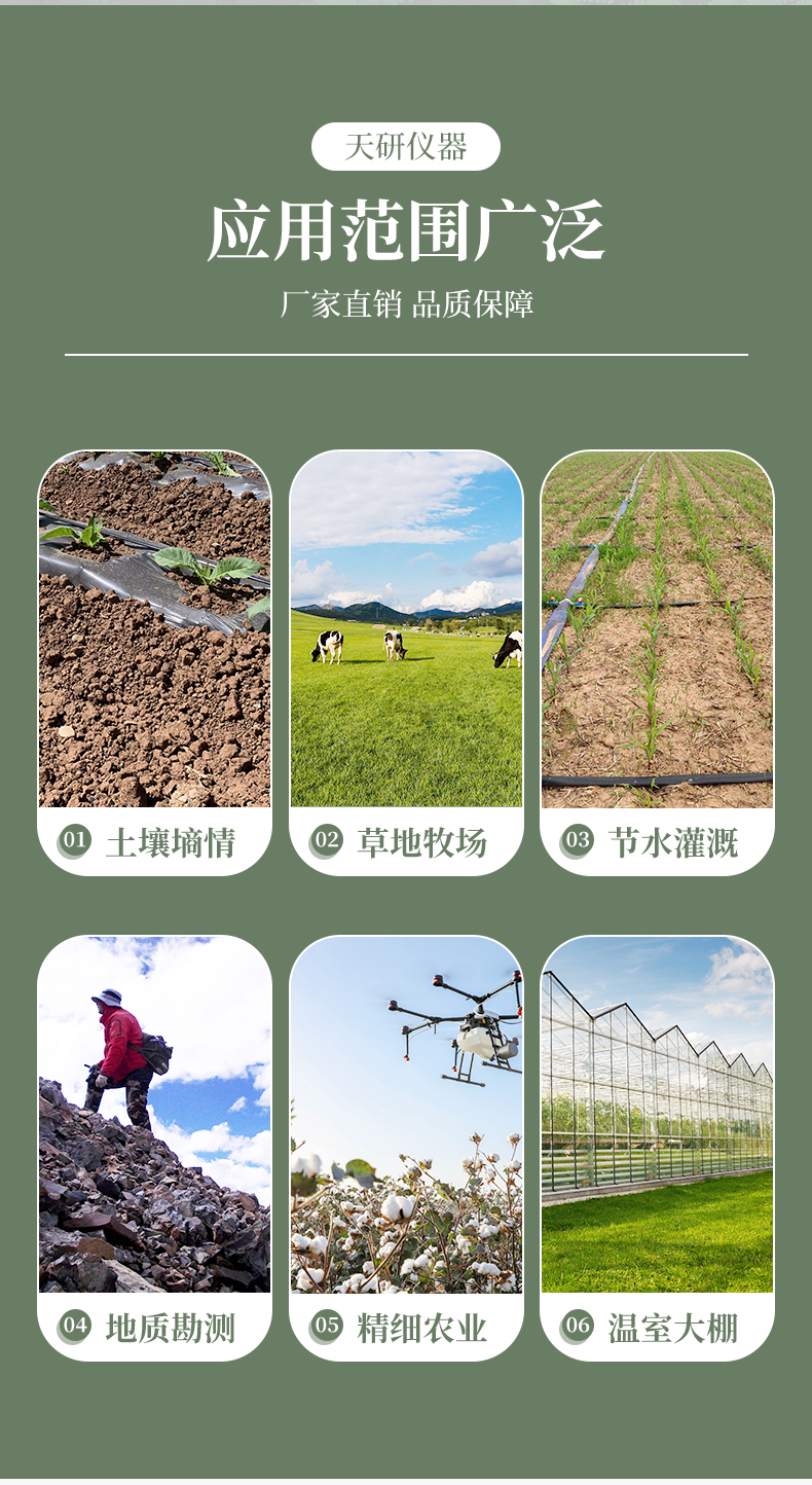 該儀器廣泛應(yīng)用于旱作節(jié)水灌溉、精細(xì)農(nóng)業(yè)、林業(yè)、地質(zhì)勘探、植物培育、溫室大棚種植、水利、環(huán)保、科學(xué)試驗(yàn)等領(lǐng)域。
