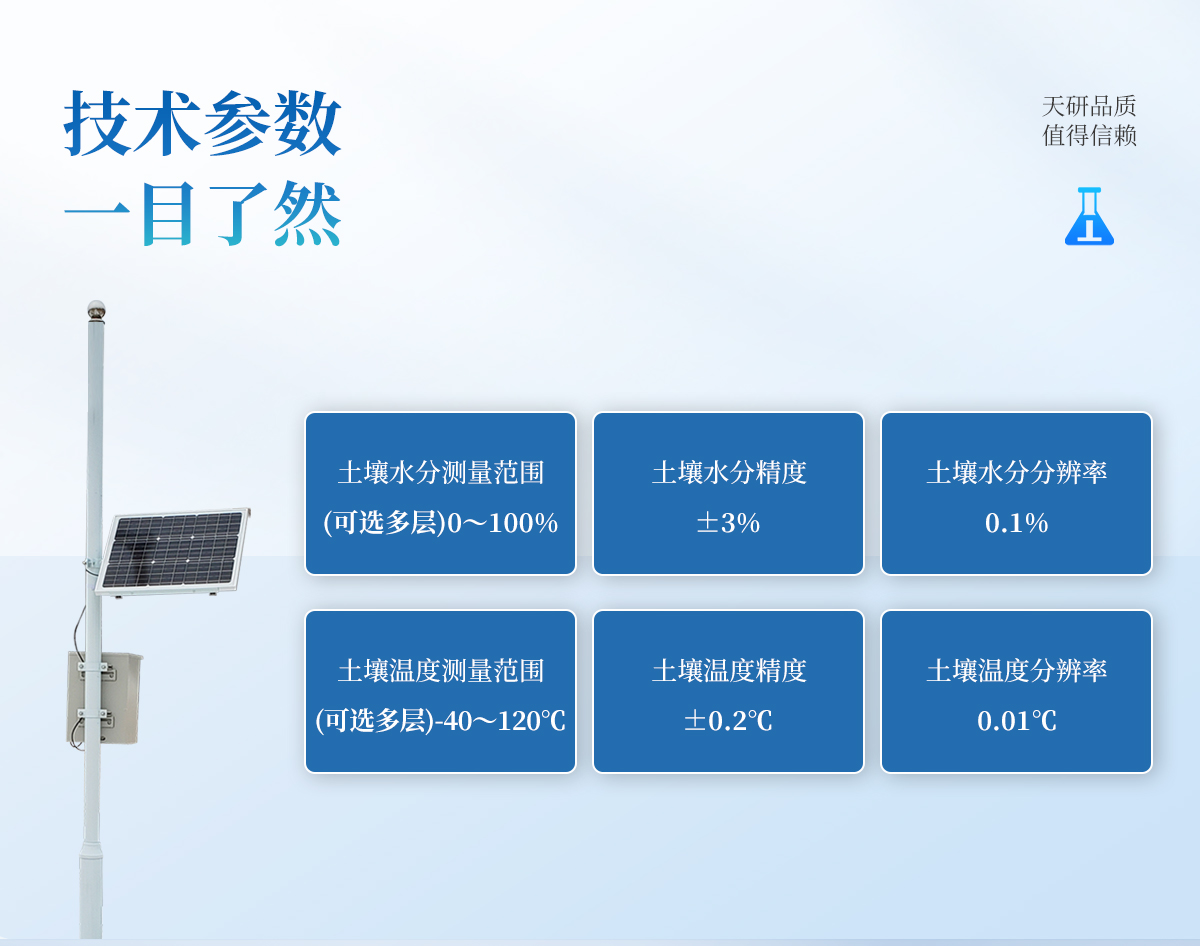 | 主控制器技術(shù)參數(shù) 數(shù)據(jù)存儲(chǔ)空間:≥100000條 記錄間隔:1分-24小時(shí)可調(diào) 數(shù)據(jù)傳輸:無線傳輸 工作環(huán)境:-30℃~80℃ 供電方式:220v市電、太陽能供電系統(tǒng)同時(shí)使用 | 傳感器技術(shù)參數(shù) 空氣濕度:0~100% 精度:±3% 分辨率:0.1% 光照 :-20~80℃ 精度:±2% 雨量 :-20~80℃ 承雨口徑:φ200mm 精度:±2% 分辨率:0.2mm 土壤水分:測量精度:±3% 工作溫度范圍:-20℃~50℃ 土壤ec:測量精度:±4% 土壤EC測量范圍:0.2~12mS/cm 土壤溫度:精度:±0.2℃ 測量范圍:-40℃~120℃ |