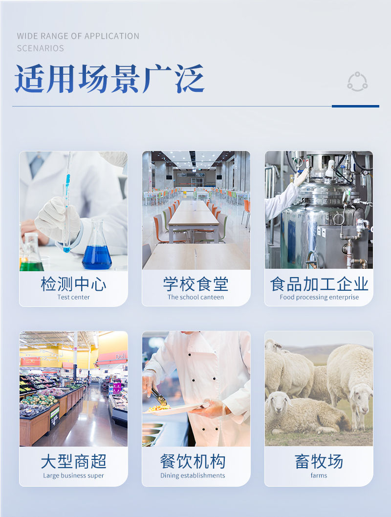 該多功能食品安全檢測儀為集成化食品安全快速檢測分析設備,廣泛應用于市場監(jiān)管局、食品肉產(chǎn)品深加工企業(yè)、學校食堂、衛(wèi)生部門、畜牧部門、屠宰場、檢驗檢疫部門等單位使用。