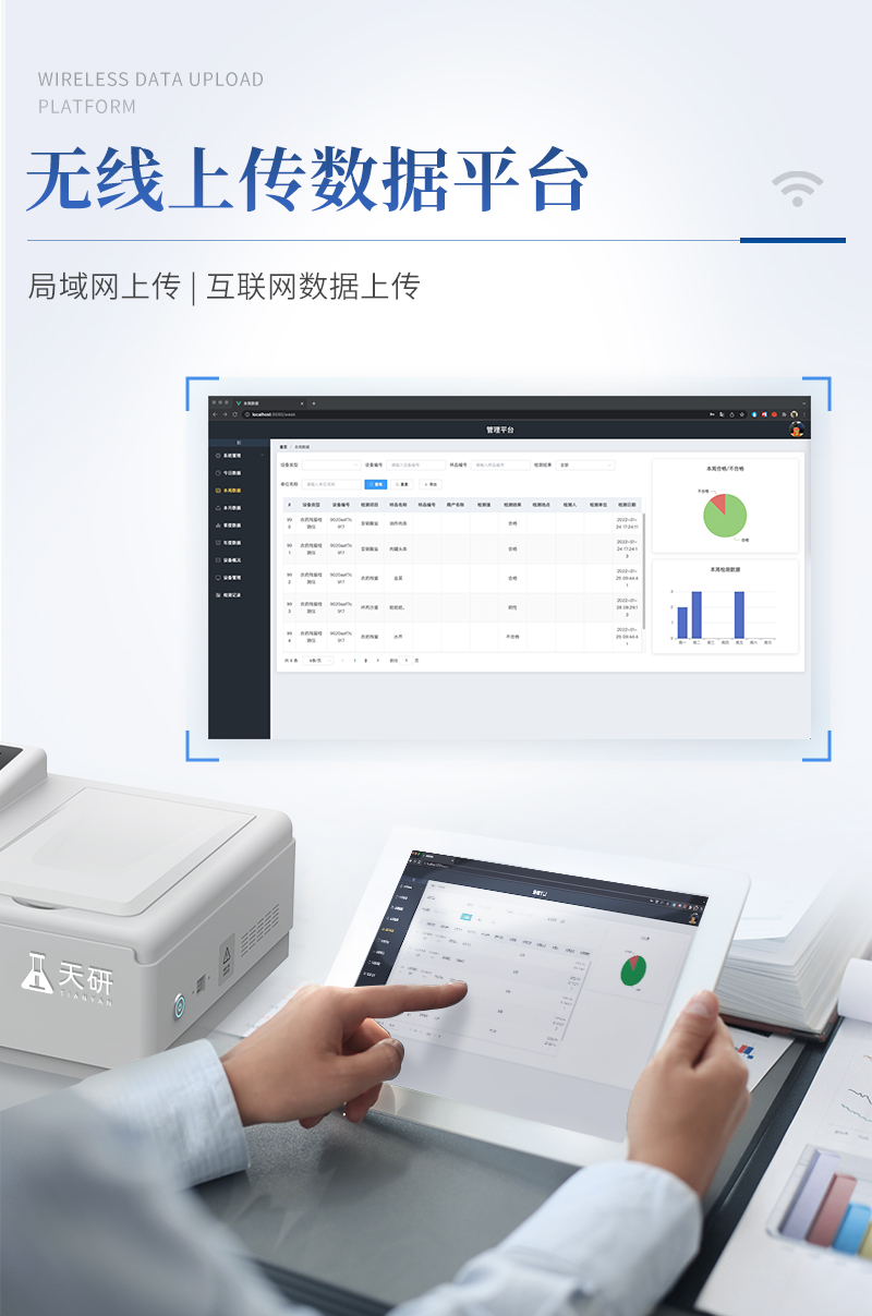 | 儀器采用手提式一體化系統(tǒng)檢測(cè)技術(shù),將分光光度模塊、新型農(nóng)殘檢測(cè)模塊、數(shù)字化管理模塊、無(wú)線通訊模塊高度集成于一體,支持檢測(cè)200種食品安全檢測(cè)項(xiàng)目,同時(shí)預(yù)留升級(jí)檢測(cè)方法。 | 儀器檢測(cè)模塊標(biāo)準(zhǔn)化、智能化,檢測(cè)項(xiàng)目可隨意自由組合。檢測(cè)箱體內(nèi)置多個(gè)標(biāo)準(zhǔn)檢測(cè)單元,檢測(cè)模塊可以調(diào)整配置。 | 顯示屏幕:儀器采用10.1英寸豎向液晶觸摸屏顯,搭配運(yùn)行安卓智能操作系統(tǒng),主控芯片采用ARM Cortex-A7,RK3288/4核處理器,主頻1.88Ghz,操作方便,性能更強(qiáng)。 | 檢測(cè)通道:≥12通道;采用精密旋轉(zhuǎn)比色池設(shè)計(jì),使用同芯片同光源校準(zhǔn)精度,解決不同光源之間的誤差值,更加準(zhǔn)確**。(1-12通道間誤差0.1%,**號(hào):ZL202022821055.2) | 儀器光源:高精度進(jìn)口四波長(zhǎng)冷光源,每個(gè)通道均配置 410、520、590、630nm 波長(zhǎng)光源,標(biāo)配**的光路切換裝置,**光路切換功能可實(shí)現(xiàn)64波長(zhǎng),并且所有檢測(cè)項(xiàng)目可實(shí)現(xiàn)所有通道同時(shí)檢測(cè)。 | 設(shè)備可一鍵校準(zhǔn),自動(dòng)保存校準(zhǔn)數(shù)據(jù),自動(dòng)對(duì)比校驗(yàn),得到精準(zhǔn)光源,采用Android SP存儲(chǔ)數(shù)據(jù),光源數(shù)據(jù)永不丟失,方便每一次使用。 | 通訊接口:配備無(wú)線通信模塊、4G(APN)通訊模塊、藍(lán)牙傳輸,同時(shí)具有雙USB接口以及RJ45網(wǎng)線接口,可以多方式實(shí)現(xiàn)數(shù)據(jù)保存及數(shù)據(jù)傳輸 | 存儲(chǔ)方式:支持U盤(pán)存儲(chǔ),標(biāo)準(zhǔn)USB接口,免驅(qū)動(dòng)安裝。檢測(cè)結(jié)果存儲(chǔ)容量20萬(wàn)條以上,可生成Excel表格進(jìn)行拷貝,并具有登錄保護(hù)功能。 | 智能化操作系統(tǒng): | 1)操作系統(tǒng):儀器可在同一檢測(cè)界面自動(dòng)對(duì)應(yīng)相關(guān)檢測(cè)通道,一次性選擇1-12個(gè)樣品名稱,無(wú)需退出界面,節(jié)省操作時(shí)間。并可以對(duì)每個(gè)通道屬性和樣品信息單獨(dú)進(jìn)行編輯,例如送檢單位、人員,檢測(cè)人員等,打印時(shí)勾選打印顯示。 | 2)數(shù)據(jù)集成系統(tǒng):設(shè)備首頁(yè)自動(dòng)匯總分析檢測(cè)數(shù)據(jù),包含:周檢測(cè)數(shù)據(jù)、月檢測(cè)數(shù)據(jù),全部檢測(cè)總數(shù)量,均包含檢測(cè)總數(shù),合格數(shù),不合格數(shù),以及相關(guān)柱形分析圖,各項(xiàng)檢測(cè)數(shù)據(jù)一目了然,無(wú)需電腦查詢,更加快捷直觀。 | 3)數(shù)據(jù)庫(kù)系統(tǒng):十幾項(xiàng)數(shù)據(jù)庫(kù)分類管理儀器:包含項(xiàng)目類型、項(xiàng)目數(shù)據(jù)、檢測(cè)數(shù)據(jù)、歷史記錄、國(guó)標(biāo)信息、曲線信息、采樣信息、檢測(cè)信息、受檢信息、復(fù)核信息、圖表信息、光源校準(zhǔn)信息、打印樣式信息、樣品庫(kù)信息等等,數(shù)據(jù)庫(kù)之間互相協(xié)調(diào)聯(lián)動(dòng)保證數(shù)據(jù)的真實(shí)完整性。同時(shí)產(chǎn)品數(shù)據(jù)庫(kù)以及歷史檢測(cè)記錄支持一鍵檢索功能。 | 4)限量規(guī)判系統(tǒng):具有限量查詢、添加物質(zhì)合規(guī)判定系統(tǒng)。檢測(cè)出結(jié)果后,系統(tǒng)自動(dòng)調(diào)用系統(tǒng)數(shù)據(jù)庫(kù)中相關(guān)國(guó)標(biāo)進(jìn)行比對(duì)判定,客觀顯示判定結(jié)果是否合格。 | 5)項(xiàng)目預(yù)設(shè)系統(tǒng):儀器具有任務(wù)預(yù)設(shè)模塊,一鍵提前預(yù)設(shè),給出方便快捷的新檢測(cè)方案,每一個(gè)任務(wù)分別可以設(shè)置不同的樣品、批次、編號(hào)、來(lái)源、備注、抽樣信息、檢測(cè)信息、受檢信息、復(fù)核信息等更多信息。樣品送檢時(shí)一鍵調(diào)取保存信息,并可多次調(diào)取,大大提高檢測(cè)效率。 | 6)數(shù)據(jù)監(jiān)管系統(tǒng):同步對(duì)接監(jiān)管平臺(tái),數(shù)據(jù)可局域網(wǎng)和互聯(lián)網(wǎng)數(shù)據(jù)上傳,檢測(cè)結(jié)果可選擇直接傳至食品安全監(jiān)管平臺(tái)。進(jìn)行區(qū)域食品安全監(jiān)管及大數(shù)據(jù)分析處理與數(shù)據(jù)統(tǒng)計(jì),檢測(cè)區(qū)域食品安全長(zhǎng)短期動(dòng)態(tài),達(dá)到食品安全問(wèn)題預(yù)估、預(yù)警。 | 7)打印系統(tǒng):內(nèi)置全新打印機(jī),新創(chuàng)自定義打印方式,可按需靈活勾選控制:產(chǎn)品合格證(國(guó)家農(nóng)業(yè)部標(biāo)準(zhǔn)要求),二維碼,抽樣信息、檢測(cè)信息,受檢信息、復(fù)核信息、抽樣日期、檢測(cè)日期等信息的打印。 | 供電模式:儀器交直流兩用,直流12V供電,可連接車(chē)載電源,可配6ah大容量充電鋰電池,電量可實(shí)時(shí)顯示,方便戶外流動(dòng)測(cè)試。 | 膠體金檢測(cè)模塊:采用雙通道CMOS成像處理技術(shù)及膠體金免疫層析技術(shù),可同時(shí)讀取雙膠體金卡數(shù)據(jù),自動(dòng)采集、處理分析,將檢測(cè)結(jié)果顯示,并可根據(jù)參考限值自動(dòng)判斷檢測(cè)結(jié)果,可檢測(cè)常見(jiàn)的獸藥殘留、生物毒素、抗生素、違禁添加物等。 | 1)探測(cè)技術(shù):CMOS成像探測(cè); | 2)檢測(cè)通道:1個(gè)通道; | 3)檢測(cè)方式:消線法和比色法; | 4)顯示模式:陰性或陽