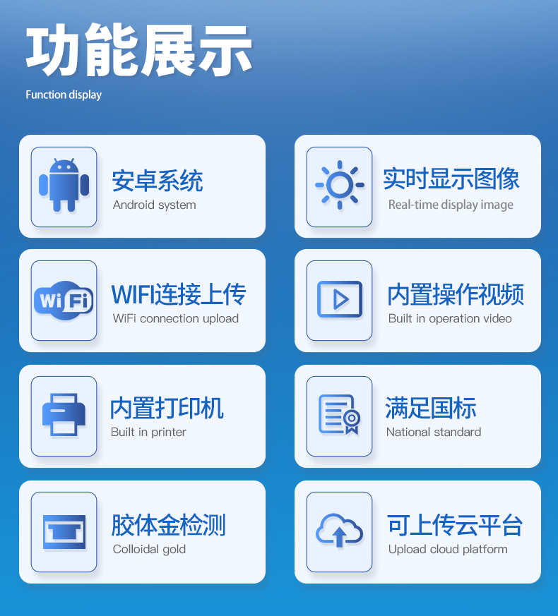 | 安卓智能操作系統(tǒng),采用更加**UI交互界面,儀器具有wifi聯(lián)網(wǎng)上傳、4G聯(lián)網(wǎng)傳輸、GPRS無線遠(yuǎn)傳、網(wǎng)線連接功能,快速批量上傳數(shù)據(jù)。 | 智能化程度高,儀器具有自檢功能:具有開機(jī)自檢和調(diào)零功能,具有自動(dòng)檢測重復(fù)性功能。 | 新一代高速熱敏打印機(jī),檢測完成可自動(dòng)打印檢測報(bào)告和二維碼。 | 儀器帶有監(jiān)管平臺(tái),數(shù)據(jù)可局域網(wǎng)和互聯(lián)網(wǎng)數(shù)據(jù)上傳,檢測結(jié)果直接傳至食品安全監(jiān)管平臺(tái)。進(jìn)行區(qū)域食品安全監(jiān)管及大數(shù)據(jù)分析處理與數(shù)據(jù)統(tǒng)計(jì),檢測區(qū)域食品安全長短期動(dòng)態(tài),達(dá)到食品安全問題預(yù)估、預(yù)警 | 一體化便攜式快檢設(shè)備,滿足現(xiàn)場及流動(dòng)檢測使用需求,能夠在同一軟件下實(shí)現(xiàn)所有檢測項(xiàng)目的檢測,并可通過同一窗口直觀顯示檢測結(jié)果。 | 膠體金模塊檢測方式:軌道式自動(dòng)傳輸掃描,檢測完成后自動(dòng)退出檢測卡。 | 一體化主機(jī),包含食品安全檢測模塊、多通道農(nóng)藥殘留檢測模塊、膠體金免疫層析檢測模塊。 | CT線自動(dòng)識(shí)別,無需手動(dòng)調(diào)整。 | 儀器具有品類多種類樣品菜單庫,可靈活選擇檢測樣品,不同的檢測通道可同時(shí)檢測不同的樣品項(xiàng)目。。 | 樣品處理簡單省力,整體操作快速、安全、便捷。 | 儀器具有自身保護(hù)功能,可設(shè)置用戶名及密碼,防止非工作人員操作等。 | 高靈敏度,高檢測精度,高重復(fù)性精度,掃描式高精度光學(xué)傳感器。 | 儀器具有重新校準(zhǔn)、鎖定、恢復(fù)出廠設(shè)置功能。 | 內(nèi)置強(qiáng)大的數(shù)據(jù)庫,可在儀器上直接選擇樣品名稱、檢測指標(biāo)、送檢單位等信息,也可在儀器上直接編輯錄入樣品名稱、檢測指標(biāo)、送檢單位等信息并保存進(jìn)樣品數(shù)據(jù)庫。 | 儀器具有重新校準(zhǔn)、鎖定、恢復(fù)出廠設(shè)置功能。 | 結(jié)果判定線可修改,對(duì)照值標(biāo)定值可保存,斷電不丟失數(shù)據(jù)。 | 兼容市場上所有的膠體金卡,使用耗材不受限制,極大增強(qiáng)用戶使用體驗(yàn)。 |